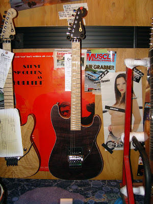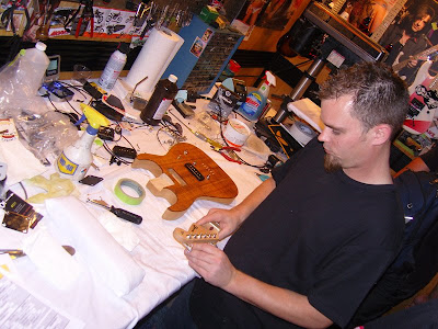 Charvel set up a full workbench in their booth this year and actually built some custom guitars from start to finish live and without commercial interruption. They all wore oil finishes, since it would be impossible to spray paint in their NAMM booth. There was one in particular we really dug, and are bringing it home. It had a real rosewood neck and a birdseye fingerboard: