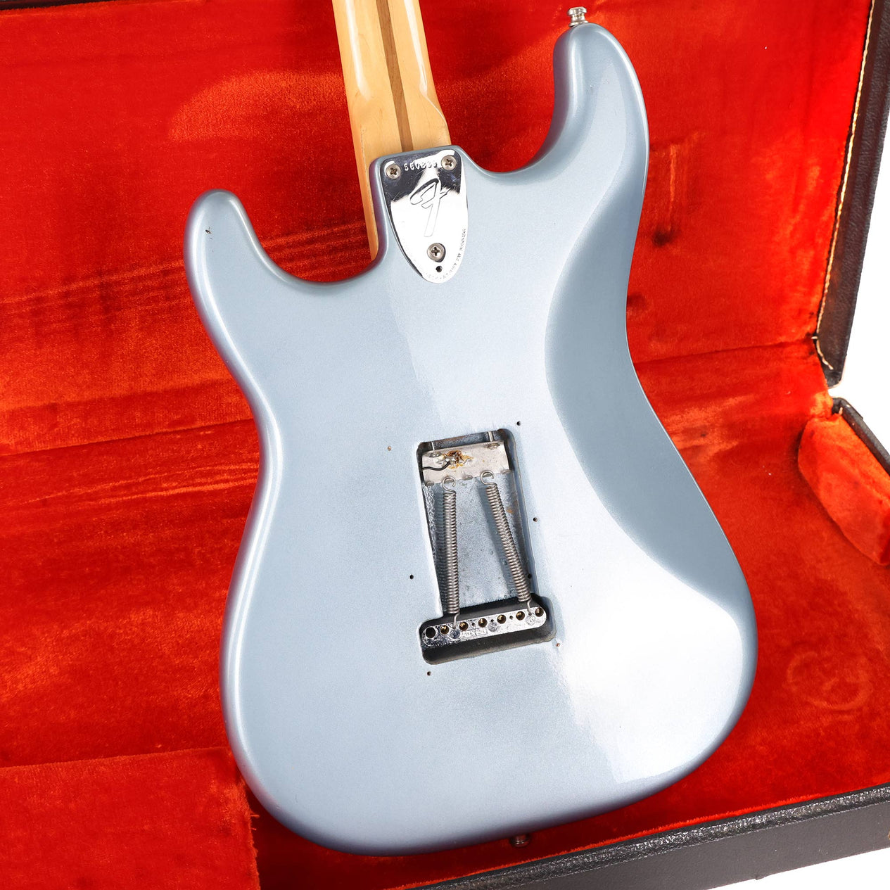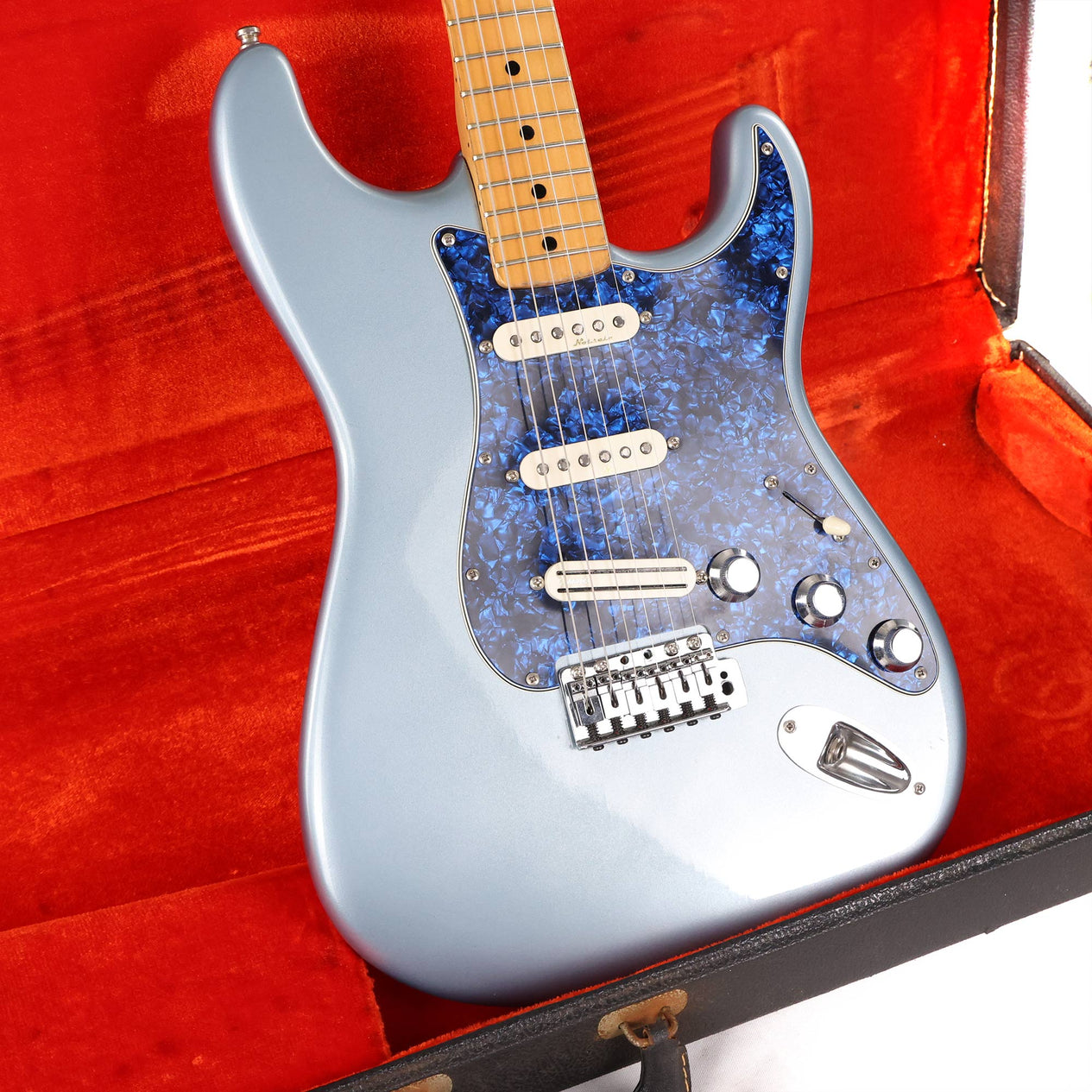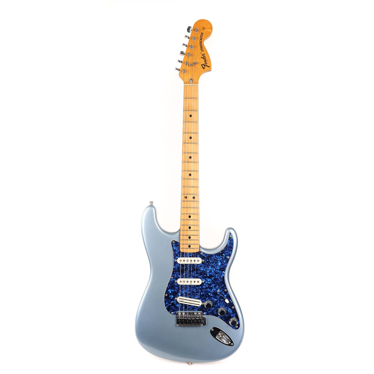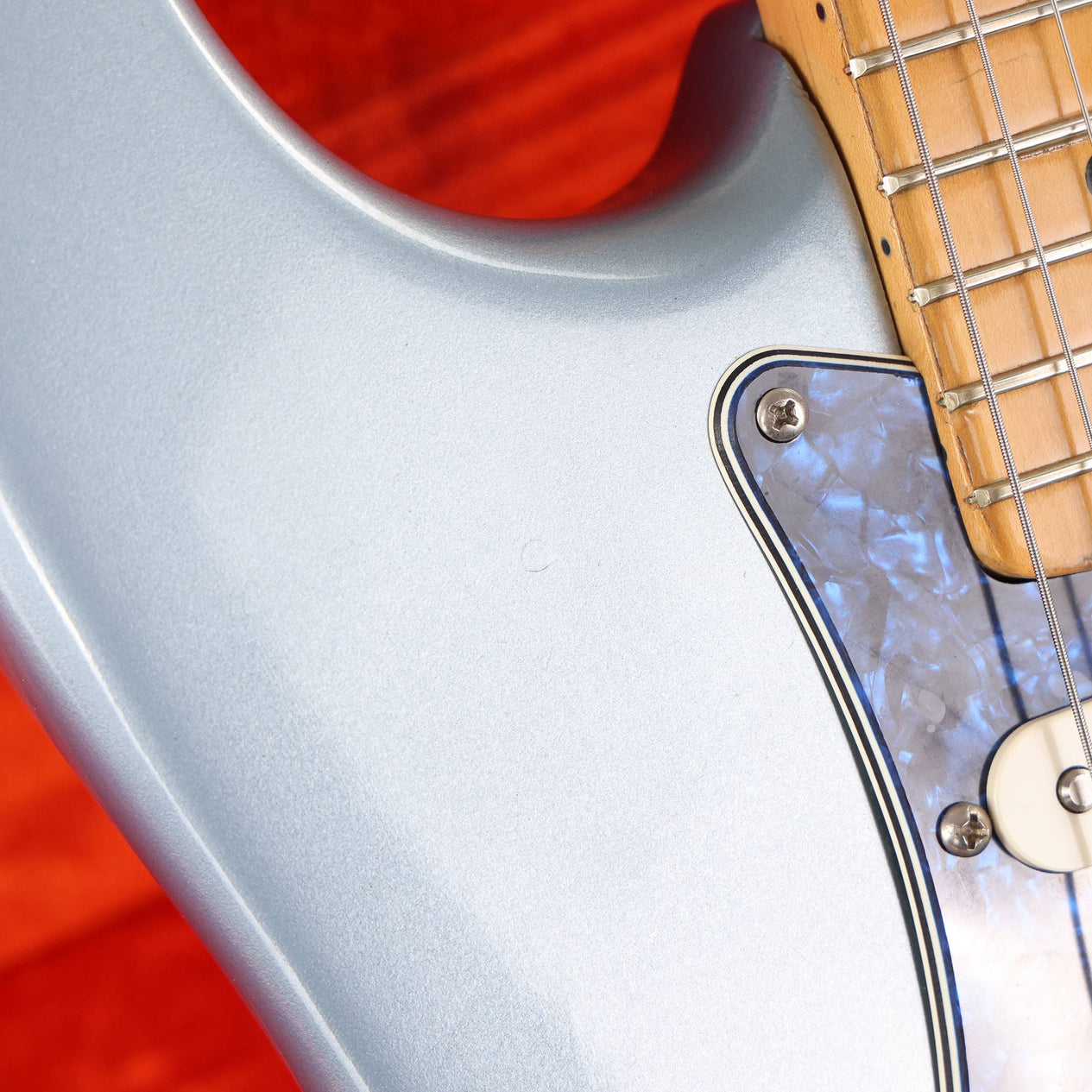 This is a refinished and rehauled 1974 Stratocaster with what looks to us like an Ice Blue Metallic color and a changed out pickguard and set of electronics. There are Fender Noiseless neck and middle pickups with DiMarzio Hot Rails in the bridge, a changed out bridge assembly and a blue pearloid pickguard (which is slightly warped). The guitar has a medium bit of fretwear on the first five frets. It plays well and includes a hardshell case.