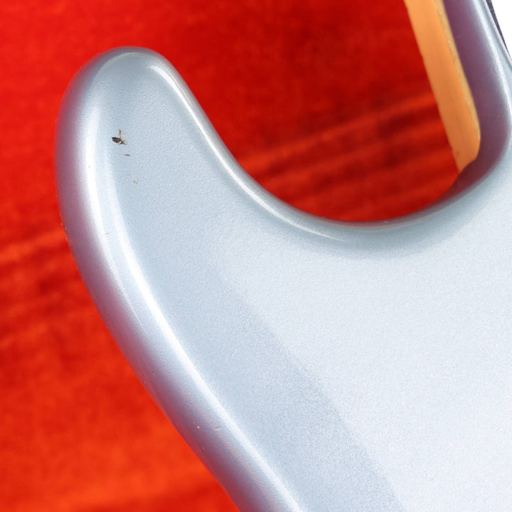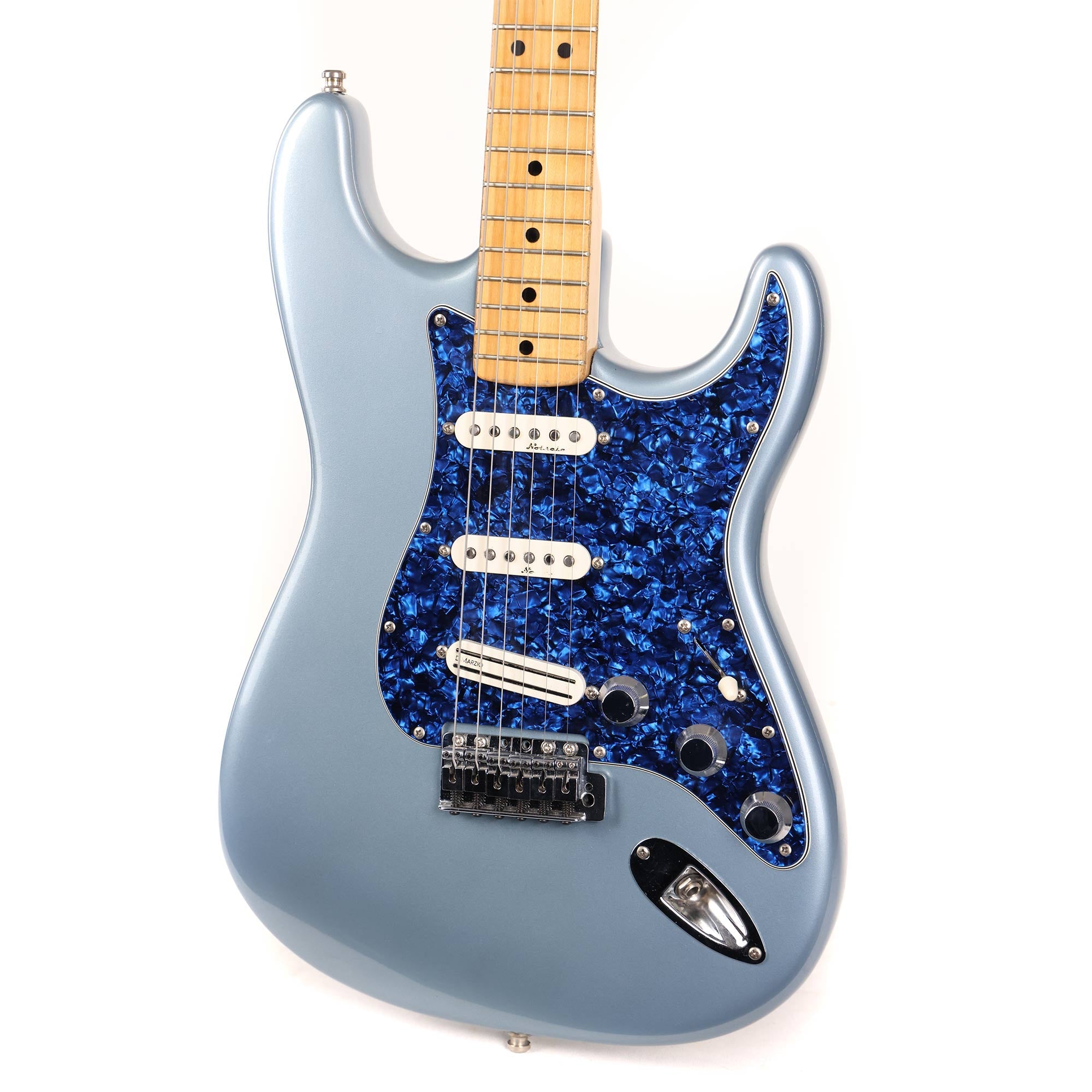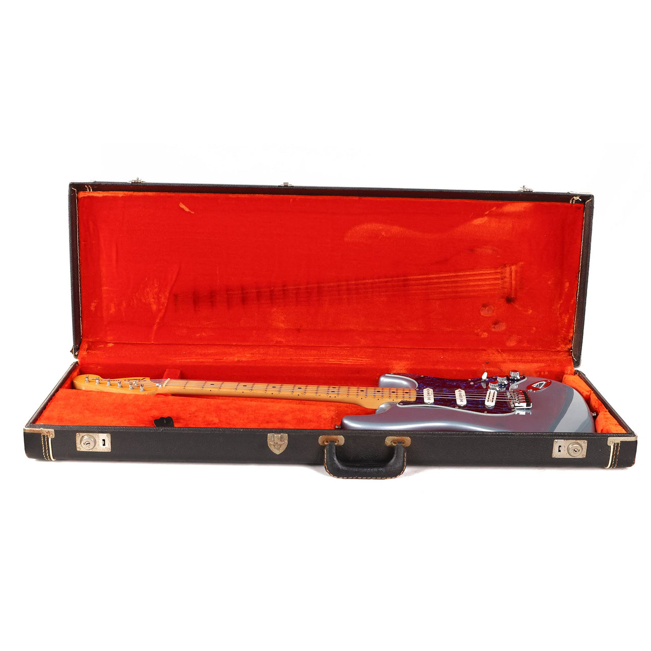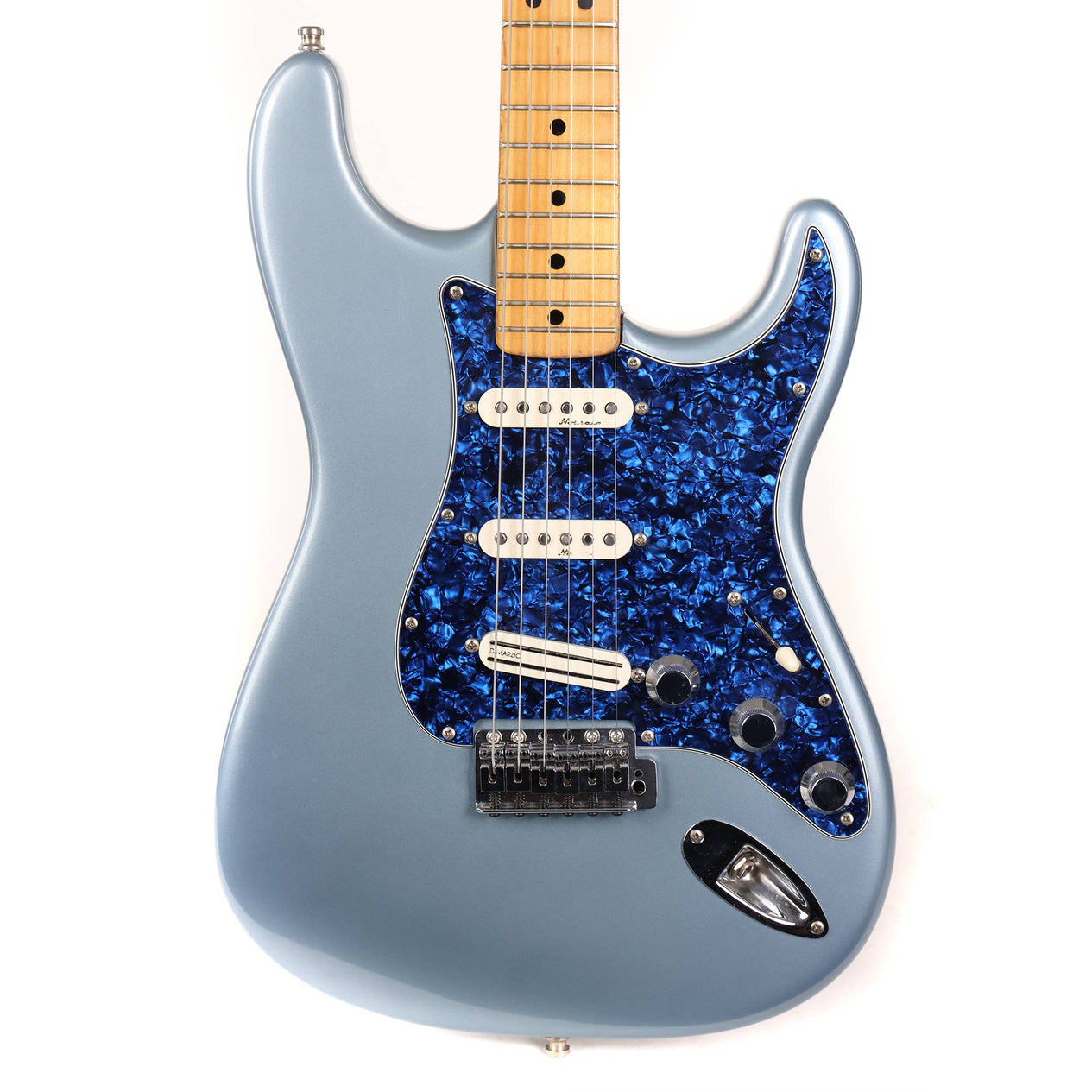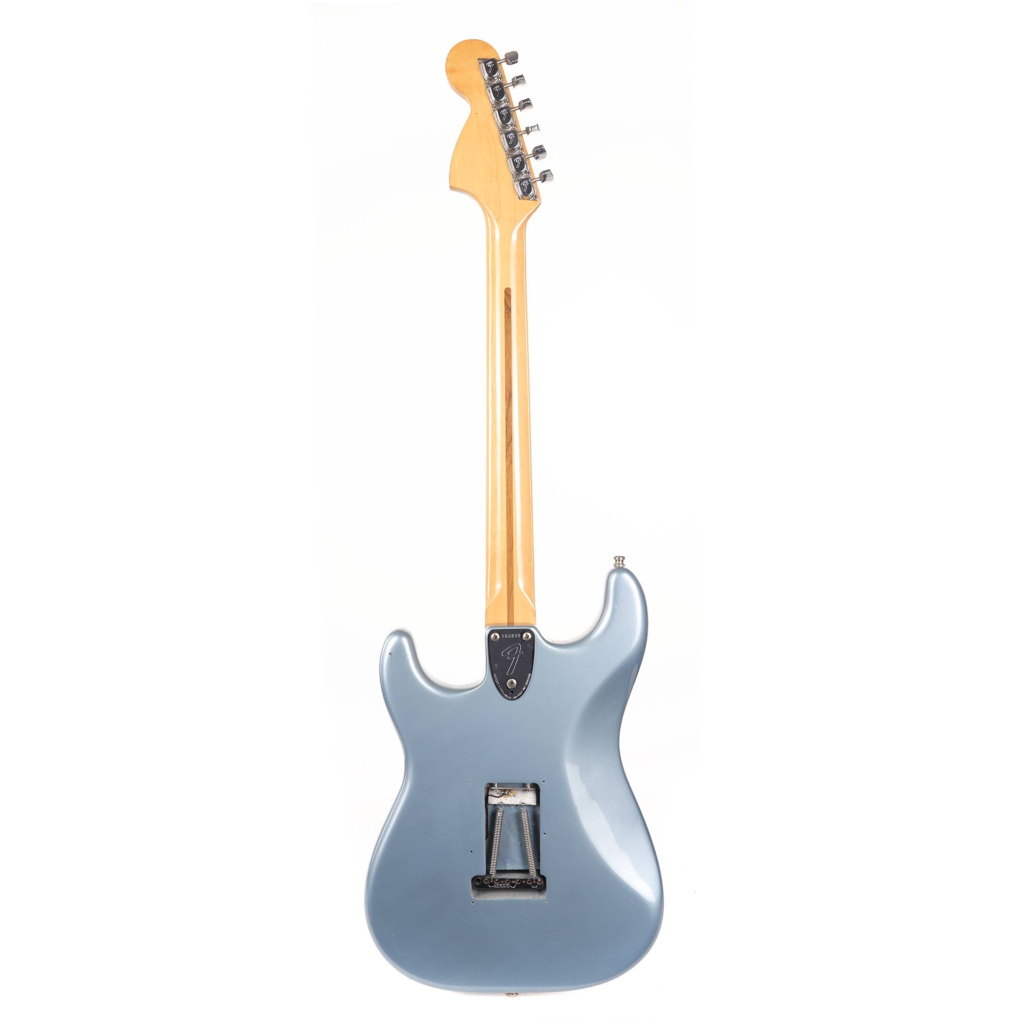 This is a refinished and rehauled 1974 Stratocaster with what looks to us like an Ice Blue Metallic color and a changed out pickguard and set of electronics. There are Fender Noiseless neck and middle pickups with DiMarzio Hot Rails in the bridge, a changed out bridge assembly and a blue pearloid pickguard (which is slightly warped). The guitar has a medium bit of fretwear on the first five frets. It plays well and includes a hardshell case.