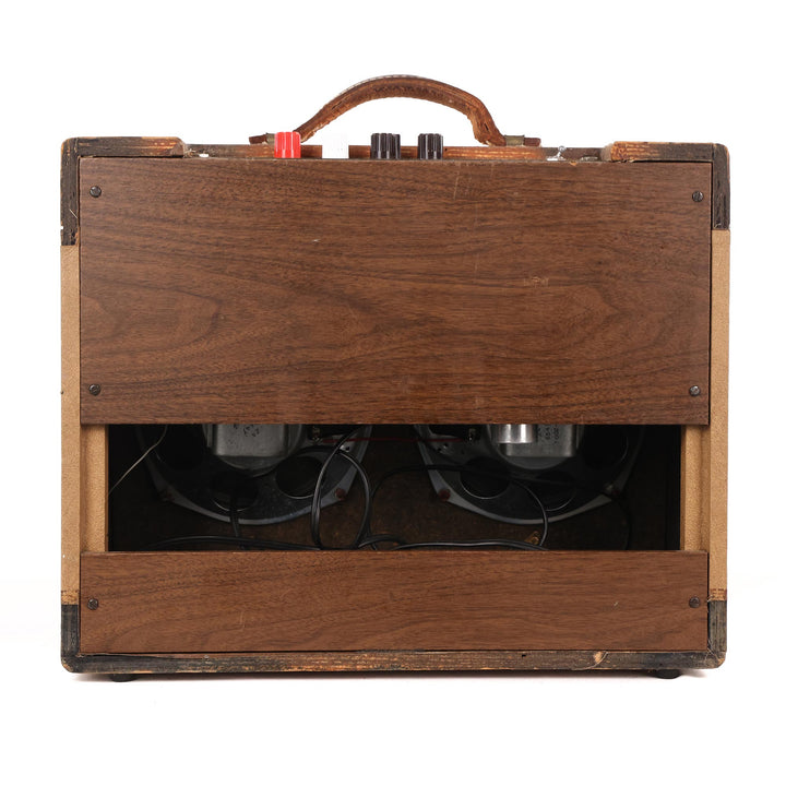 If you're looking for an awesome and inexpensive amplifier to keep in your recording studio, pick up this vintage 1965 Premier Twin-8R with onboard spring reverb! A small combo amplifier with two guitar inputs and a mic/accordion input - the simple design has Volume, Tone, Tremolo and Reverb controls. The amp sounds best dimed, with gain controlled by your volume knob. Lots of classic old-school Bluesy overdrive, and the onboard effects sounds great! Cosmetics are in very good condition, and due to the age and fragility of the amplifier we recommend not keeping it outside of a studio or residential setting - we are selling it in as-is vintage condition.