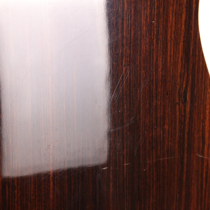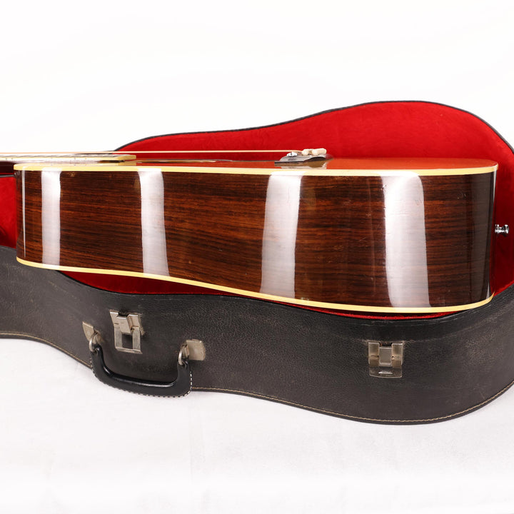 This is a fun 12-string dreadnought from Epiphone: a vintage 1970s 'blue-label' FT-165 model made in Japan. The guitar is built with a spruce top, rosewood back and sides, and a beautiful rosette with small block inlays and multi-ply binding. It's in overall very good playing condition; there's some fretwear, dings and scratches but nothing to affect the structural integrity of the guitar. A lightweight chipboard case is included.