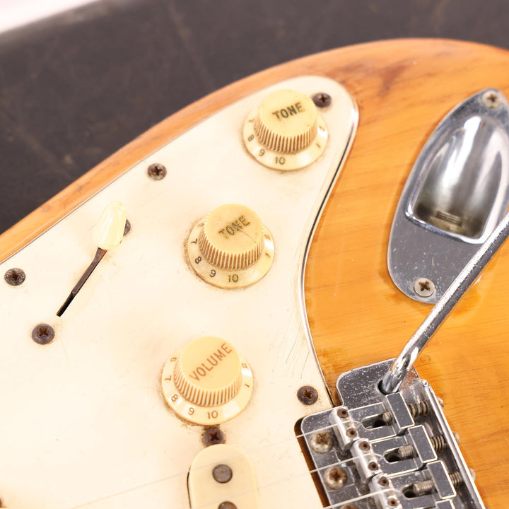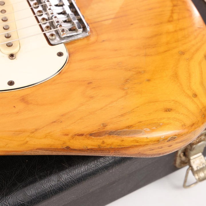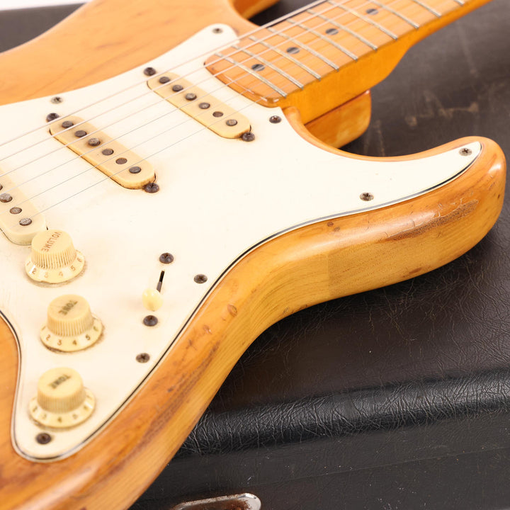 A '70s workhorse Stratocaster, you can just tell that this guitar has been loved and played on stages for years! This is a '74 that's been stripped and refinished in natural, with the neck stripped and resprayed with lacquer. The guitar has the original staggered pole pickups with a 5-way switch installed. It's been professionally refretted, and has a replacement nut installed as well. It's a gigging guitarists instrument that's ready to go for even more years of service. It is missing the backplate, and includes a non-original case and the trem arm.