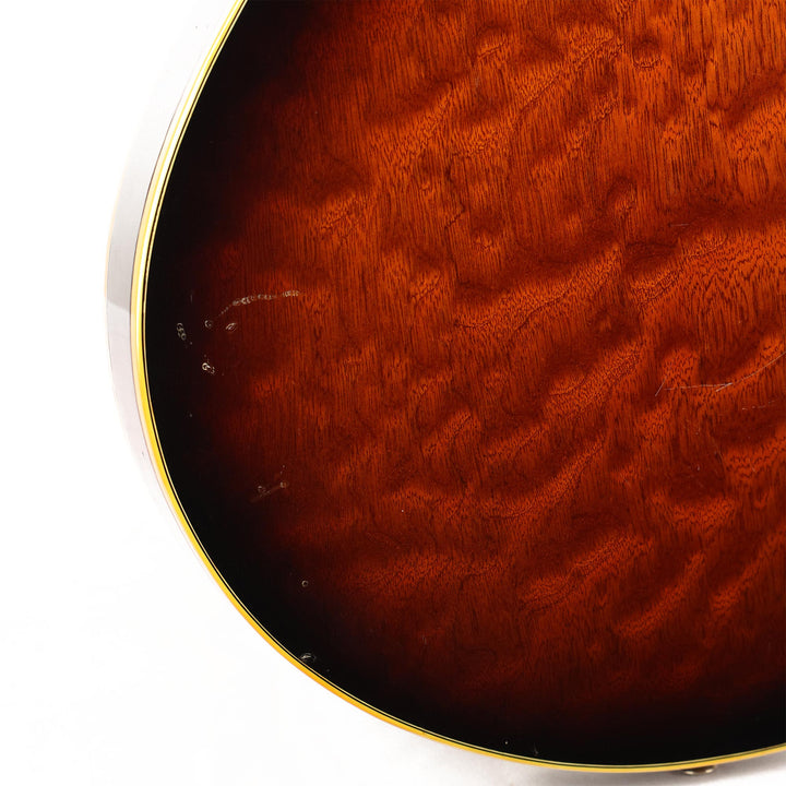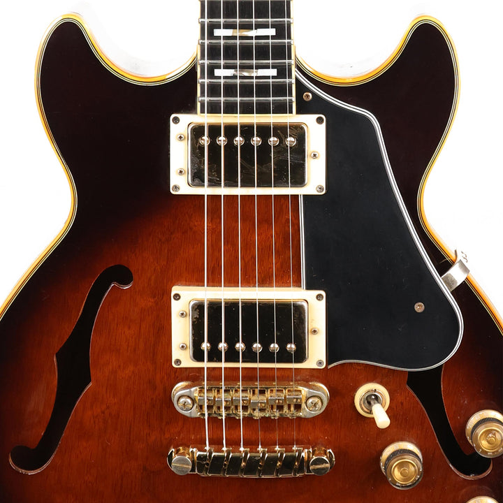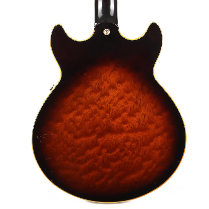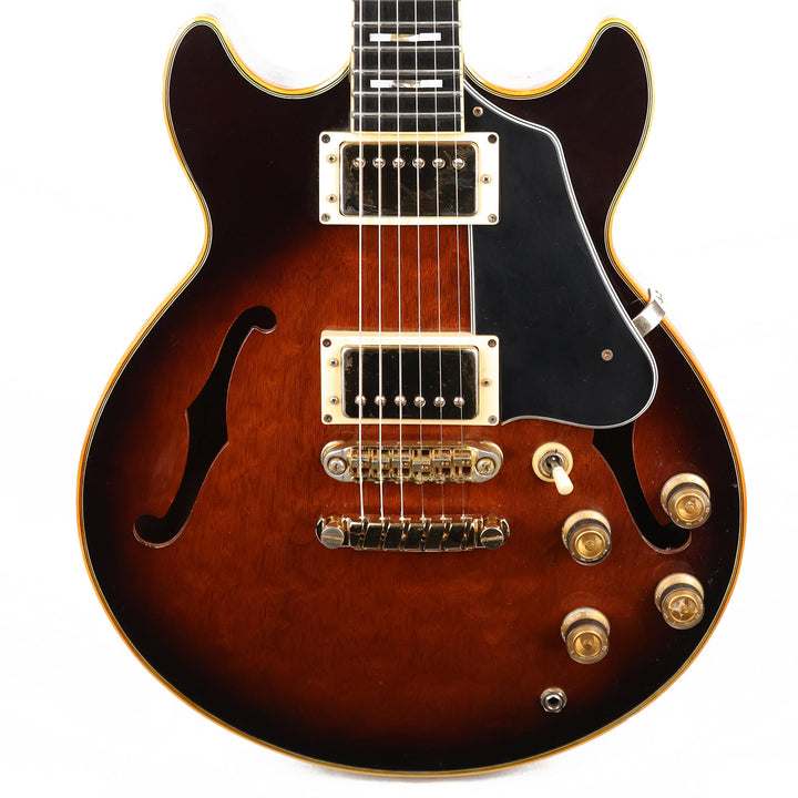 This is a vintage Ibanez AM-205 Artist model built in 1982! The guitar is a semi-hollowbody built of burl mahogany for the body with a 1-piece mahogany neck and ebony fretboard, Ibanez Super 58 humbuckers and gold hardware. The guitar is in overall very good condition with some wear around the body including dents and dings, and some scratches as well. It still plays wonderfully and is ready for even more years of service. A padded gigbag is included.