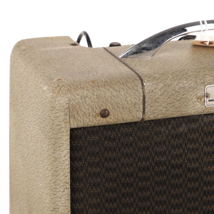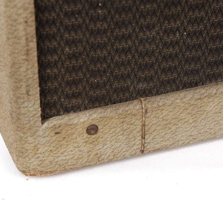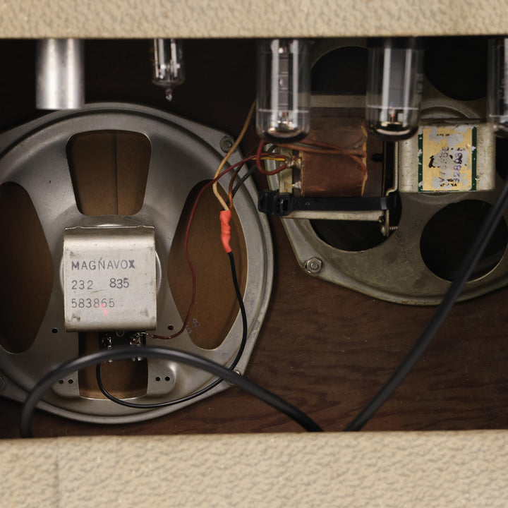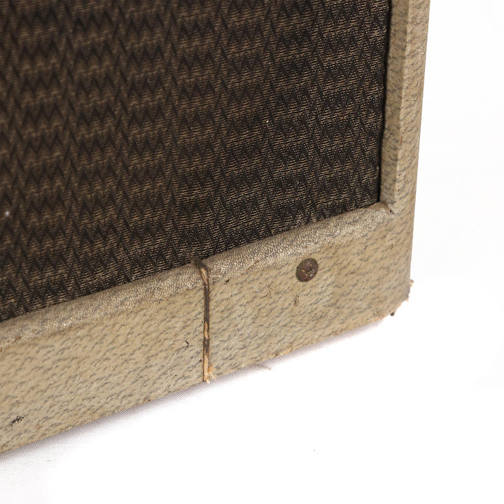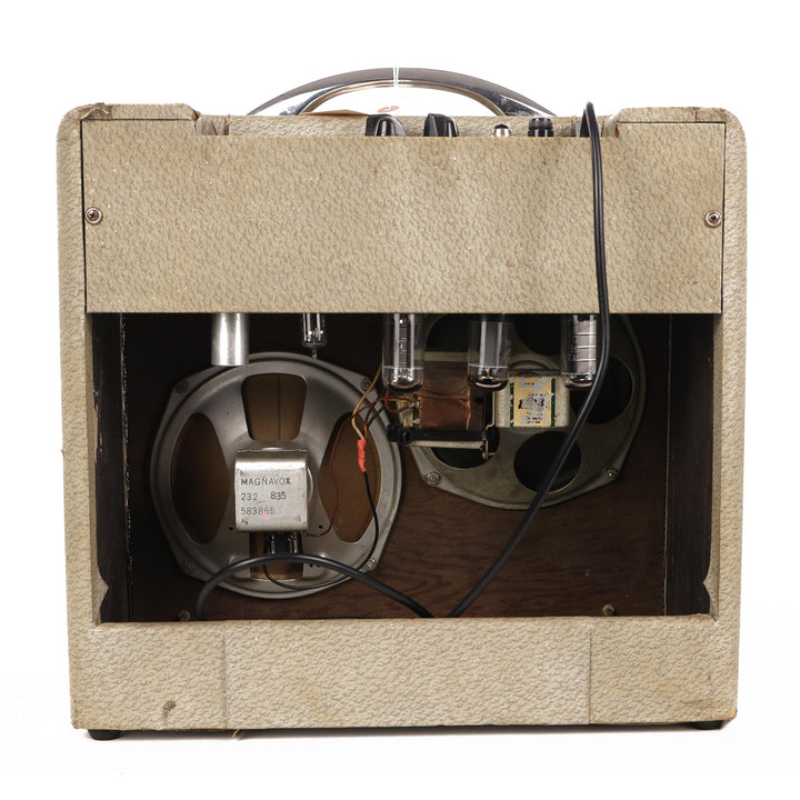 This is a vintage Alamo Futuramic 2x8" tube amplifier, built in San Antonio, Texas. The amplifier has two 8" Magnavox speakers with a simple volume and tone control layout. It's been kept in a recording studio environment and is working as it should. It has a low-wattage crunchy tone that's perfect for recording with. The power cable is converted to a modern 3-prong plug.