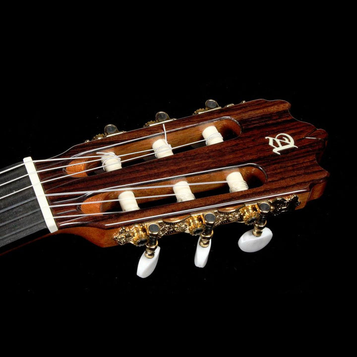 This is a used and crafted in Spain 4F classical nylon string acoustic guitar from the Alhambra Flamenco collection: a great choice for a guitar built with solid top wood for beginning to intermediate classical guitar players, with a gigbag included! The 4F is built with a solid German spruce top with sycamore back and sides, an Indian rosewood fretboard, and gold plated tuners. This guitar is in overall excellent condition with only light playwear to be seen.