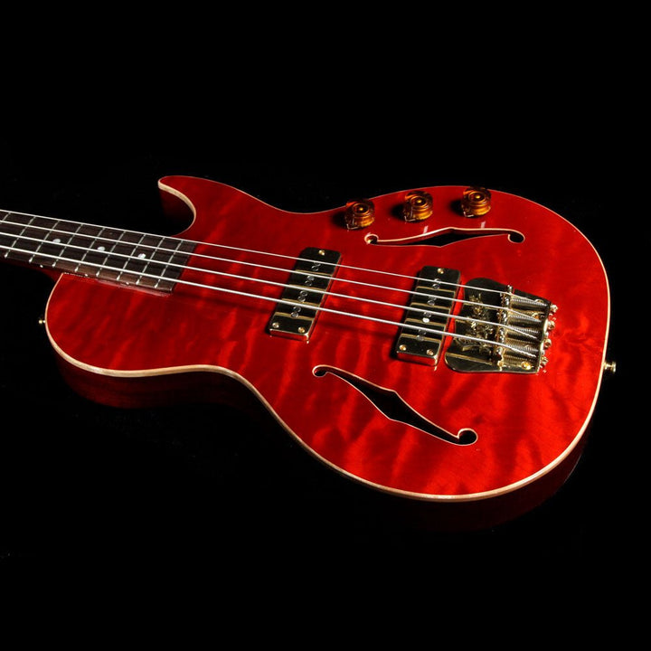This is a used and lightly played Big Sister bass from B&G Guitars, a full-scale 4-string bass with similar aesthetics as their well known Little Sister model of electric guitar. This is a handmade instrument built in Israel with a Transparent Red finish over a quilt maple top,African mahogany neck, Indian rosewood fretboard Honduran mahogany body, and two excellent sounding Aguilar pickups with two volumes and a single tone control like a J-style configuration so you can blend the two positions together however you prefer! The bass has a customized backplate that says "Old Skool" on it, with the original backplate included in the case. There are some light marks around it, no major dings or dents and the original case included!