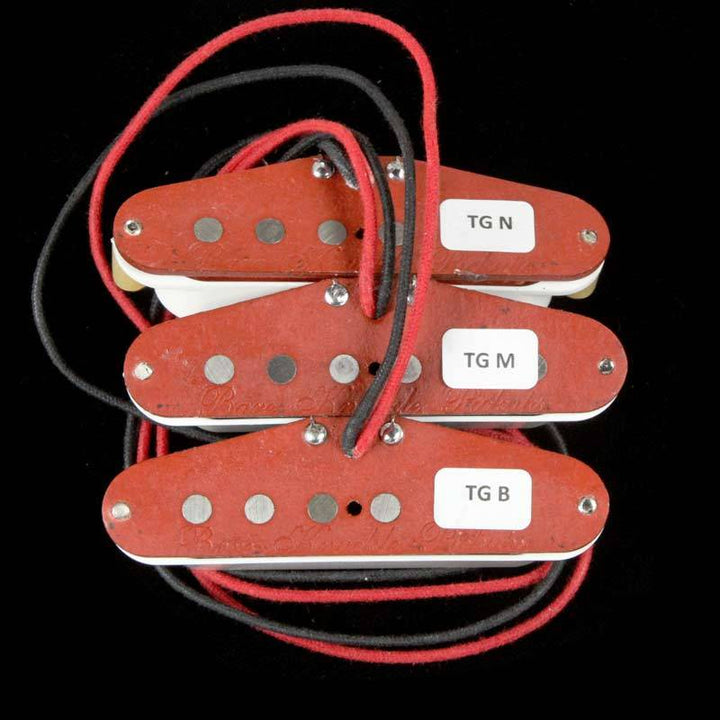 The new Boot Camp series pickups from Bare Knuckle are for the player who doesn't want to fuss with specialized covers, leg sizes, or wiring. These pickups are stripped down and offered in a few of the best configurations, and still provide exceptional tone! The True Grit family is a medium output offering, using Alnico V magnets for a super fat and rich tone, great for all types of rock, punk, and old school metal tones. This is a True Grit Strat set, featuring a RWRP middle pickup, flat magnet profile, and red and black cloth wiring.