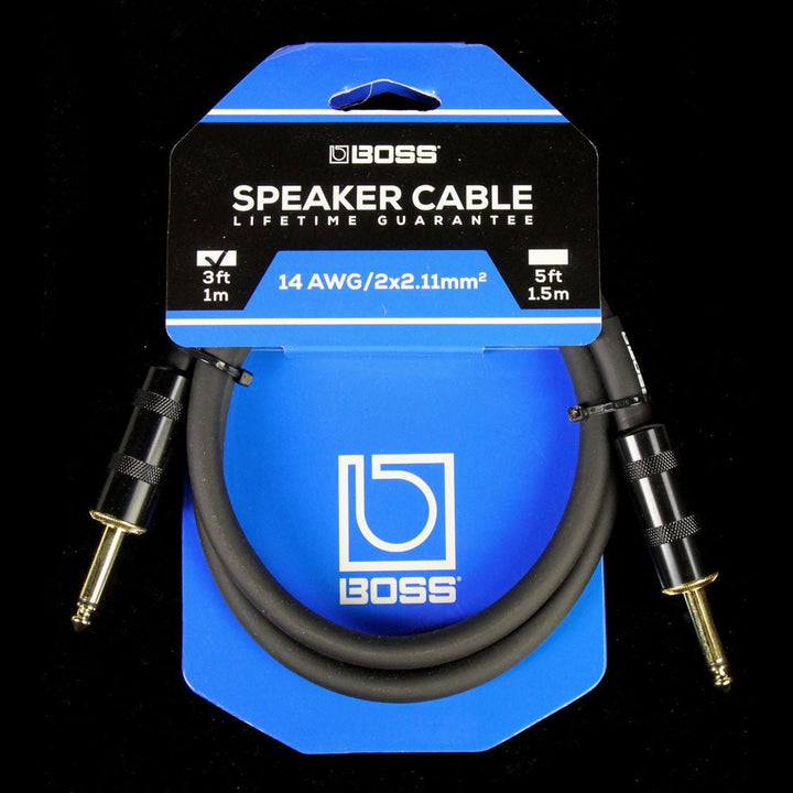 This is a 3-foot BSC-3 speaker cable from Boss, built with two straight angle connectors, 24K gold-plated contacts, heavy gauge 14AWG oxygen-free copper core wire, and a lifetime guarantee from the manufacturer.