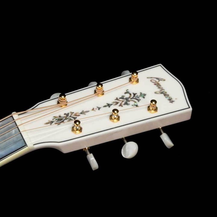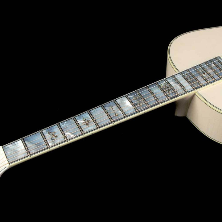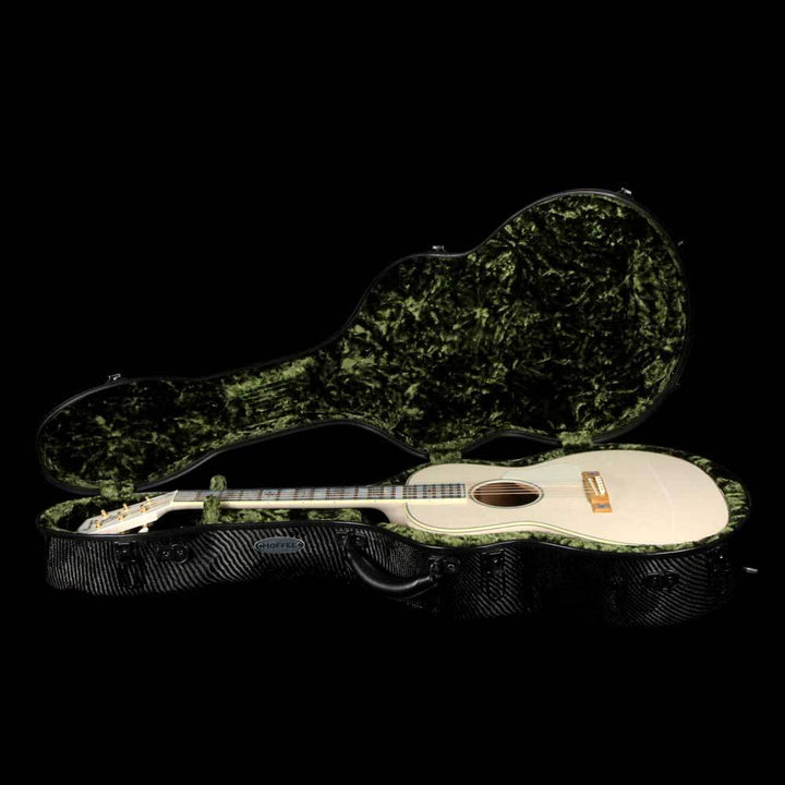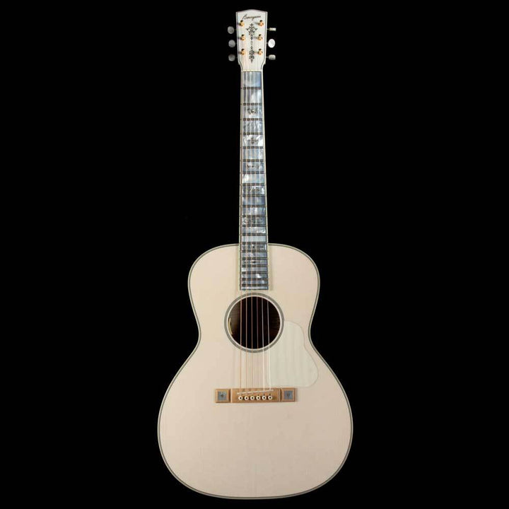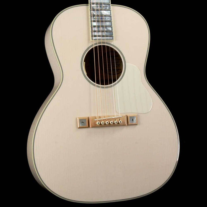 This is a very special L-DBO Whyte Rabbit acoustic guitar, a model inspired by a prominent artist requesting that Bougeois build them an all-white guitar to match their stage set. The result is this L-DBO body style with an Adirondack spruce top and transparent white finish over the curly maple back, side and neck. The guitar has Presentation mother of pearl fretboard inlays within the ziricote fretboard, white headstock overlat, and a grained ivoroid pickguard. This Whyte Rabbit is in overall excellent condition, the previous owner had a LR Baggs Anthem SL pickup installed, as well as a very high quality Hoffee case custom made for the guitar!