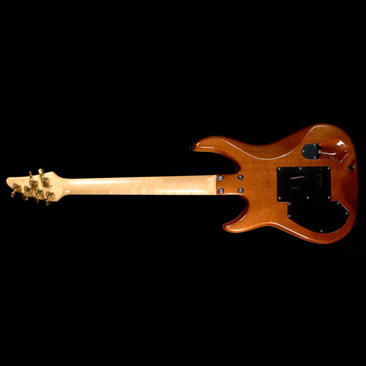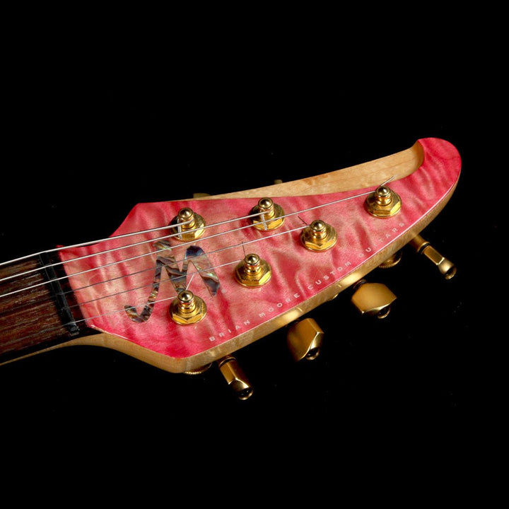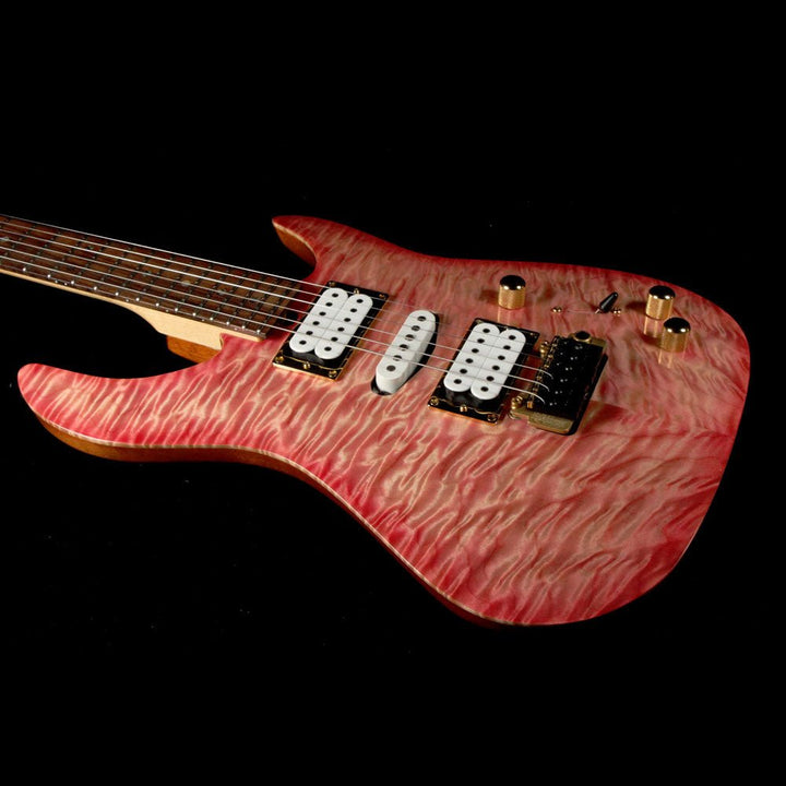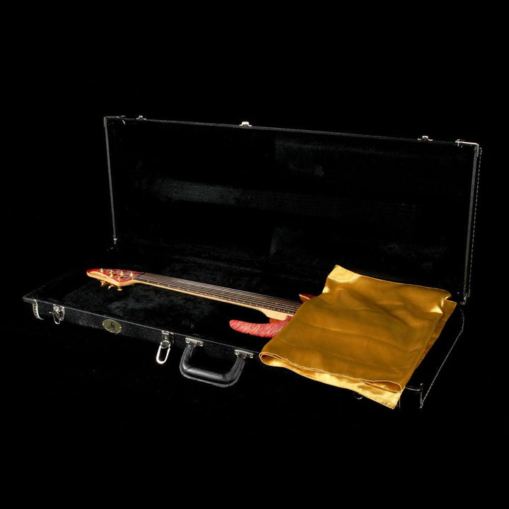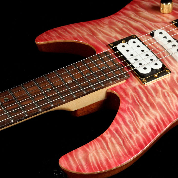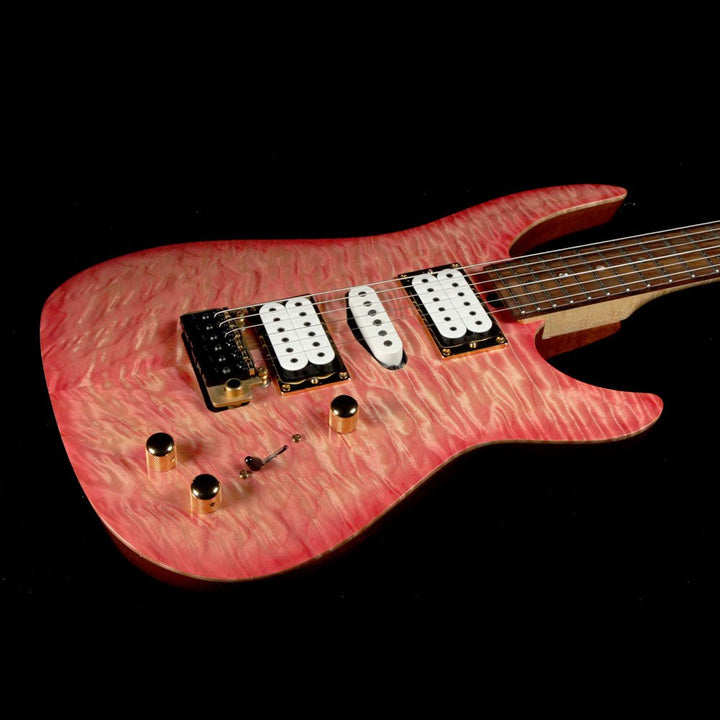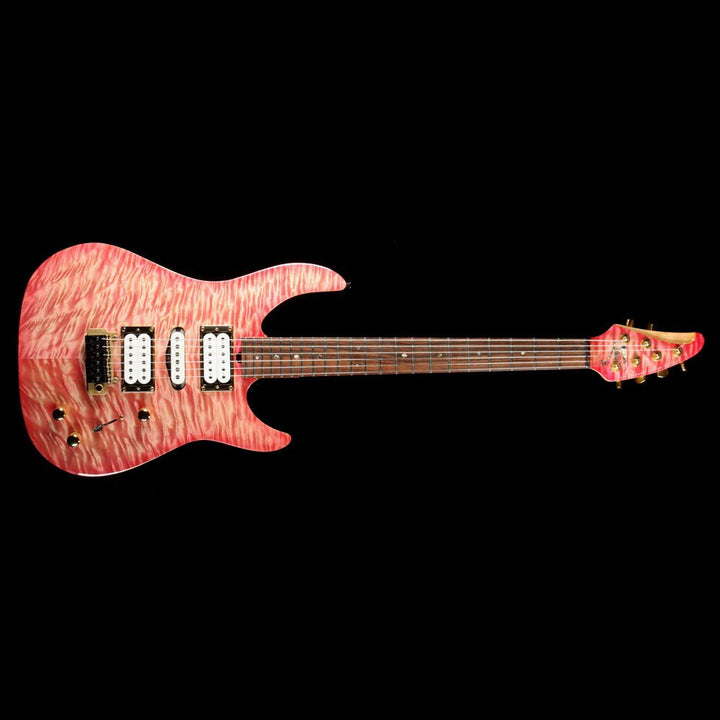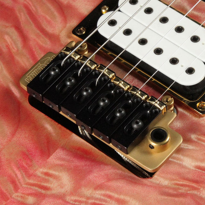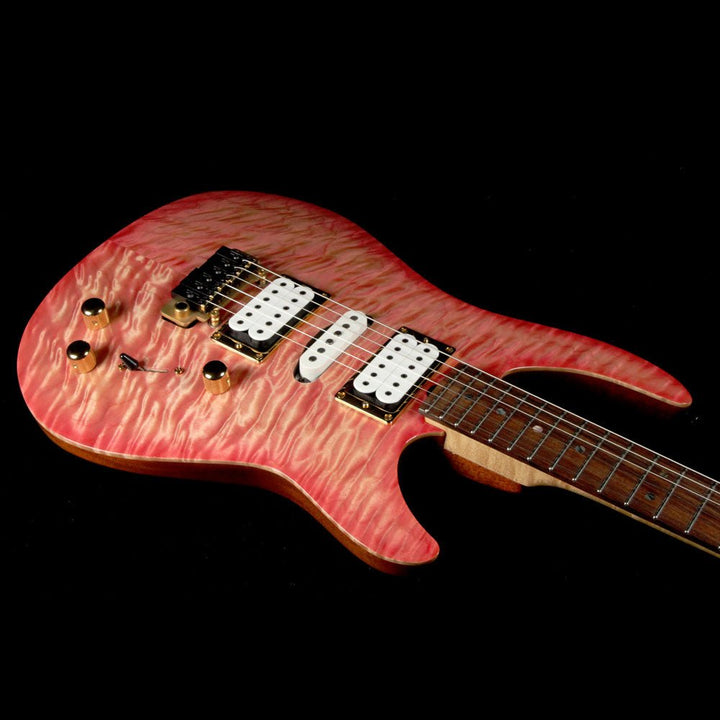 Here is a pre-owned Brian Moore C90P electric guitar in a great looking Stone Washed Strawberry finish over a beautifully quilted maple top and a mahogany body. The Stone Washed Strawberry finish was a very rare finish to see on a Brian Moore instrument! Brian Moore’s are excellent instruments made for a ton of tonal versatility in one guitar – especially this model with its HSH pickup configuration with a Wilkinson vibrato bridge that has a piezo built in. This C90P is in excellent condition with no major signs of wear on it. The pickups were swapped for DiMarzios, with the original Seymour Duncans not included.