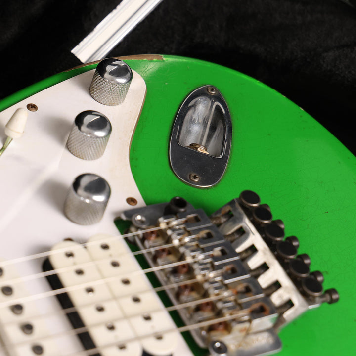 We've been running Charvel Nitro Aged San Dimas guitars for years, so we decided to finally diversify and give the finish over to a Charvel So-Cal! This is a Custom Shop Nitro Aged So-Cal (and a 24-fret fret So-Cal, at that) Masterbuilt by our friend, the incredibly talented Pat Campolattano! This one is finished in Slime Green and just asking for some vintage skateboard stickers to be placed on there. The guitar has a 1-piece quartersawn maple neck with 24 jumbo frets, a trio of versatile DiMarzio pickups and a non-recessed Floyd Rose Original trem. With that oil-finished neck and jumbo frets, it's no exaggeration to say that this one plays like butter. The slime green really makes the reverse headstock stick out on this one, we love it.