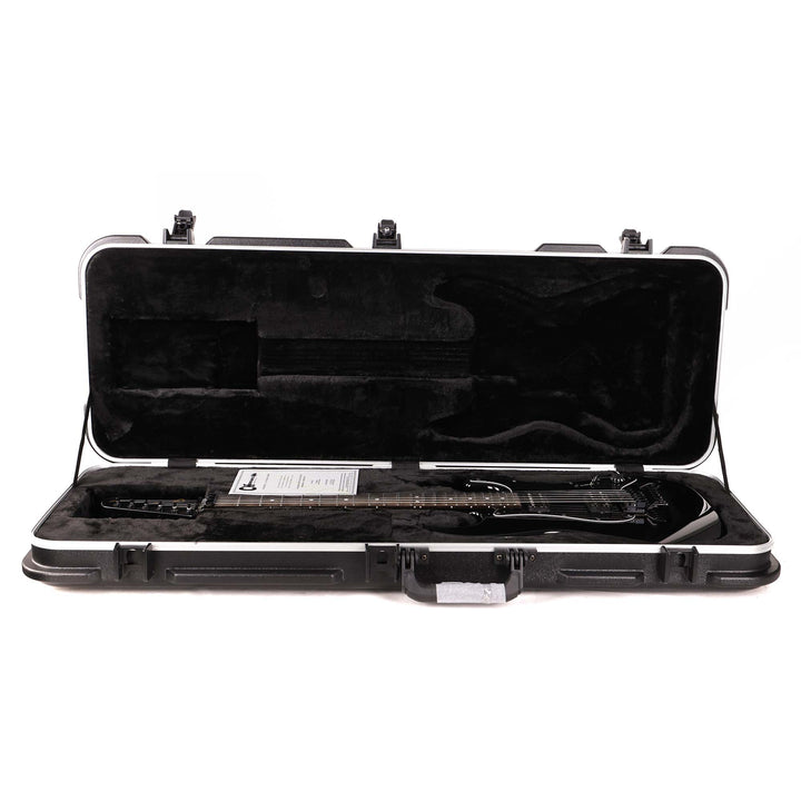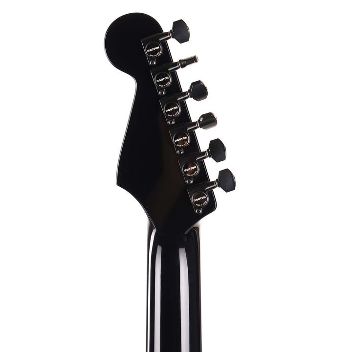 We were inspired by a few rare painted neck Charvels of the early 80s such as Keith Scotts famed 'Black Demon' to create this Double-Humbucker So-Cal. It's a Custom Shop model in poly Black with a matching neck and headstock. It's topped with a mother of pearl-inlaid ebony fretboard and two Seymour Duncan humbuckers. There's a simple setup of a 3-way switch and master volume control scooched all the way to the end of the pickguard for those who prefer it out of their way!