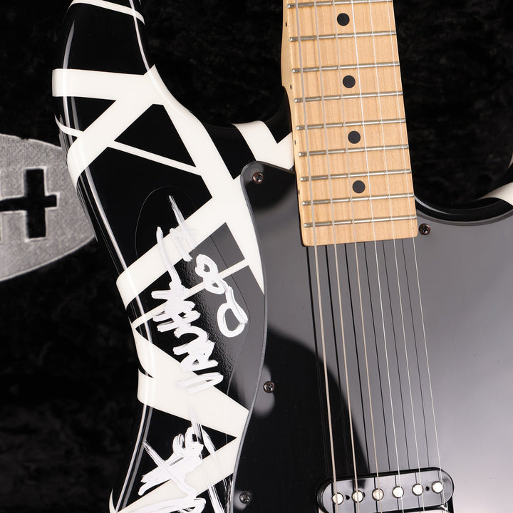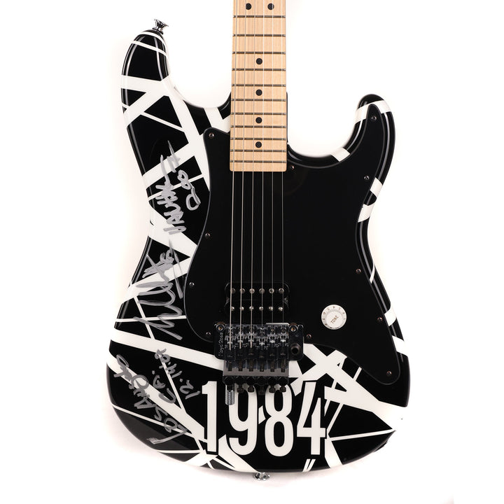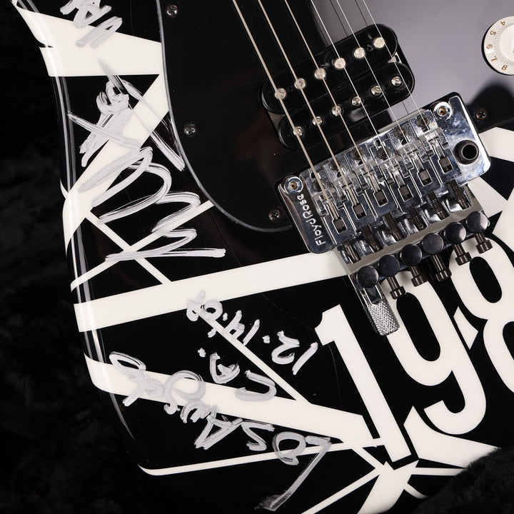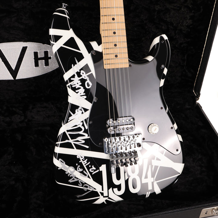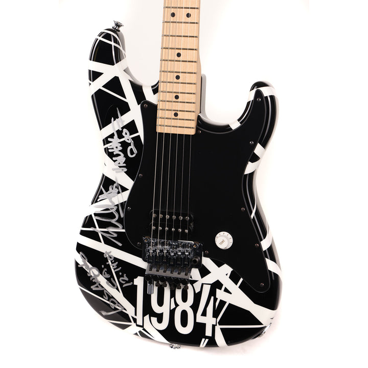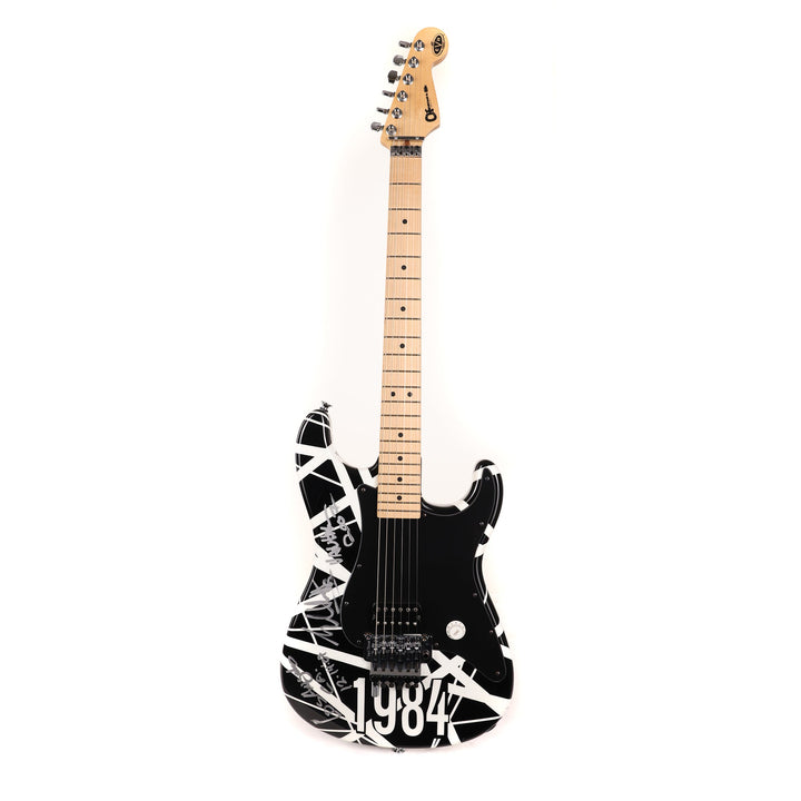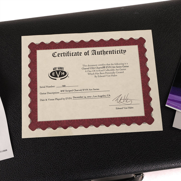 Here's a top-tier collectible instrument, a one of a kind black and white-striped (with 1984 decal, too!) Charvel Art Series guitar striped and played onstage by Eddie Van Halen. This particular guitar was played at Van Halen's concert in Los Angeles on December 14, 2007 . The single EVH pickup is wired directly to a Volume control (with a Tone knob, an EVH signature) for no-frills operation. Signed by Eddie and including a Certificate of Authenticity signed by EVH and Charvel's John Walker, this guitar is a must-have for any Van Halen collector! This instrument is in overall excellent condition.