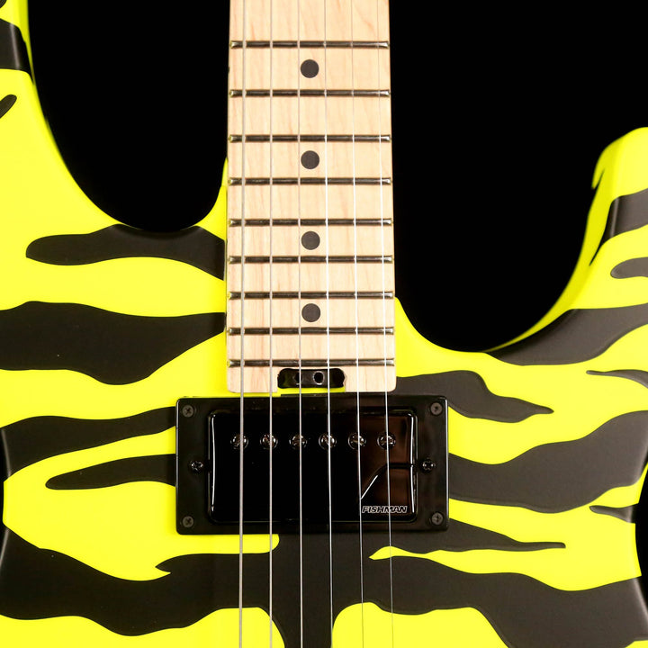 This is a used and still in overall excellent condition Charvel Pro Mod Dinky Satchel Signature model! The Yellow Bengal finish gives this one plenty of bite - it's not a nice kitty! Inspired by Steel Panther shredder Russ "Satchel" Parrish, this Dinky boasts an alder body, a maple speed neck with rolled edges and graphite reinforcements, a pair of Fishman Fluence Classic humbuckers, and of course, a Floyd Rose tremolo to provide plenty of character! The guitar includes a non-original Fender black tweed hardshell case along with trem arm.