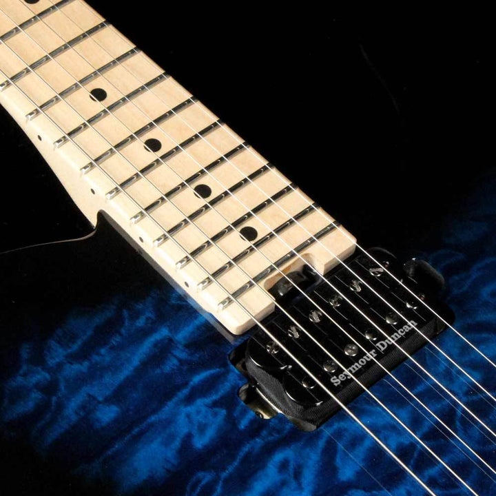 Here is a Charvel Pro Mod Series San Dimas in its Style 2 incarnation with Floyd Rose recessed tremolo and a beautiful Trans Blue Burst over a quilt maple top! The Style 2 has a 2-piece maple bolt-on neck with a thumbwheel truss butt-adjust for easy adjustments, a 12-16" compound radius, and Seymour Duncan humbuckers for a super versatile guitar that can do Rock, Metal and everything in between!