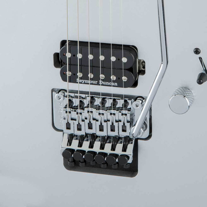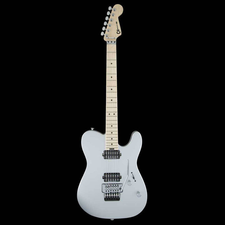 Here is a Charvel Pro Mod Series San Dimas in its Style 2 incarnation with Floyd Rose recessed tremolo and a super slick Satin Silver finish! The Style 2 has a 2-piece maple bolt-on neck with a thumbwheel truss butt-adjust for easy adjustments, a 12-16" compound radius, and Seymour Duncan humbuckers for a super versatile guitar that can do Rock, Metal and everything in between!