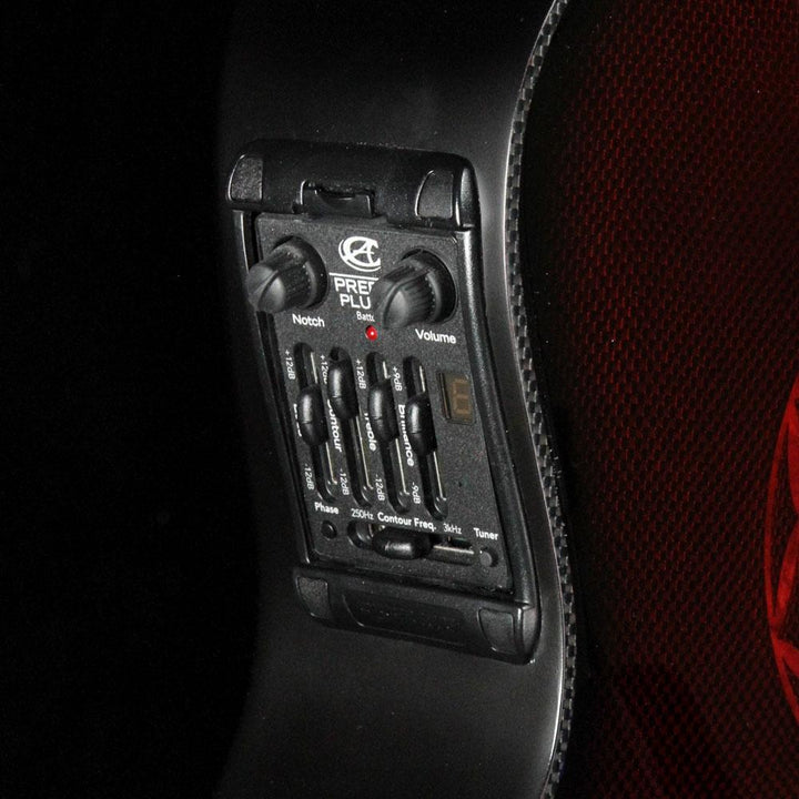 Here’s a used and still in excellent condition Composite Acoustics GX carbon fiber guitar. The GX is a grand auditorium sized cutaway guitar with a slim shape that provides easy access to the upper frets. The guitar has stainless steel frets, super sharp 18:1 ratio tuners, and Fishman Prefix Plus T electronics. This is the new 'Narrow Neck' version of the guitar with a slimmer 1.69" nut width.