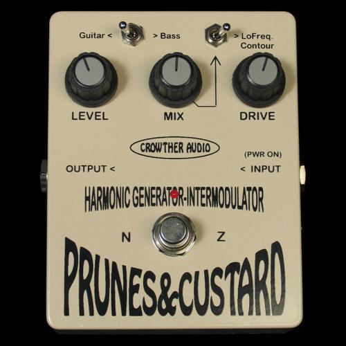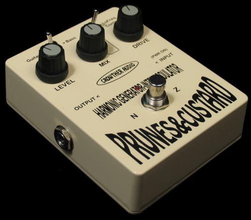 This is an Open-Box Prunes and Custard with a malfunctioning Low Frequency Contour toggle switch. It needs to be replaced, and is being sold as-is. The effect works as it should otherwise! Hand-made in New Zealand by Paul Crowther, the Prunes and Custard is a small pedal with a lot of capabilities. There is a preamp stage, the gain of which is adjusted with the Drive control. This stage followed by a special waveshaping distortion circuit. There is some treble roll-off between the preamp and the special distortion circuit. The frequency at which this treble roll-off happens can be changed with the Guitar/Bass switch. The special distortion stage produces strong harmonic overtones, mostly odd harmonic. Higher harmonics are progressively introduced with increased Drive settings and signal level, so a decaying bass guitar note can sound like a mean swept filter. Playing double notes, like 4ths or 5ths can produce some strong intermodulation effects, rather like a ring modulator, but more musical, albeit more distorted! The Mix control is a balance between the preamp stage output, (CCW) and the special distortion stage output (CW).