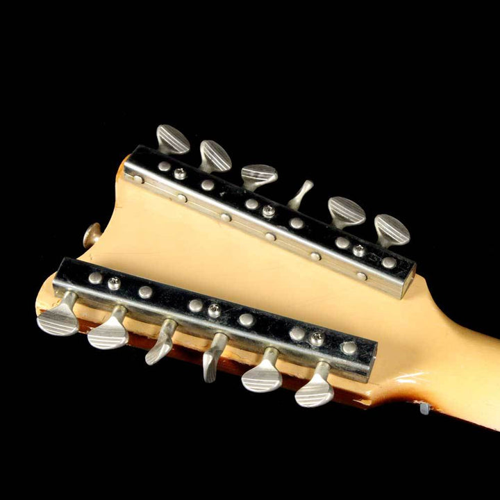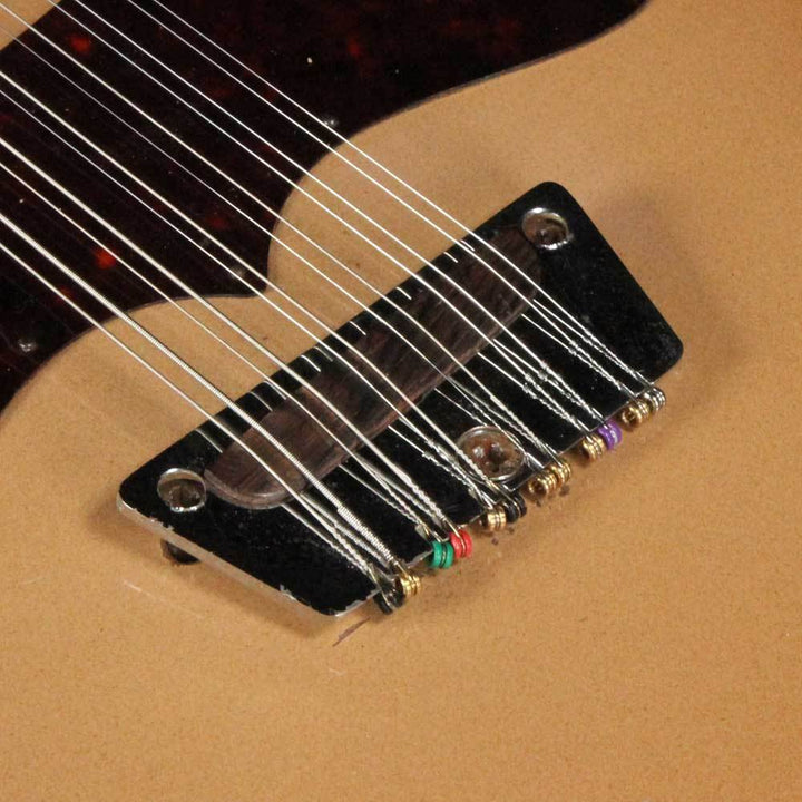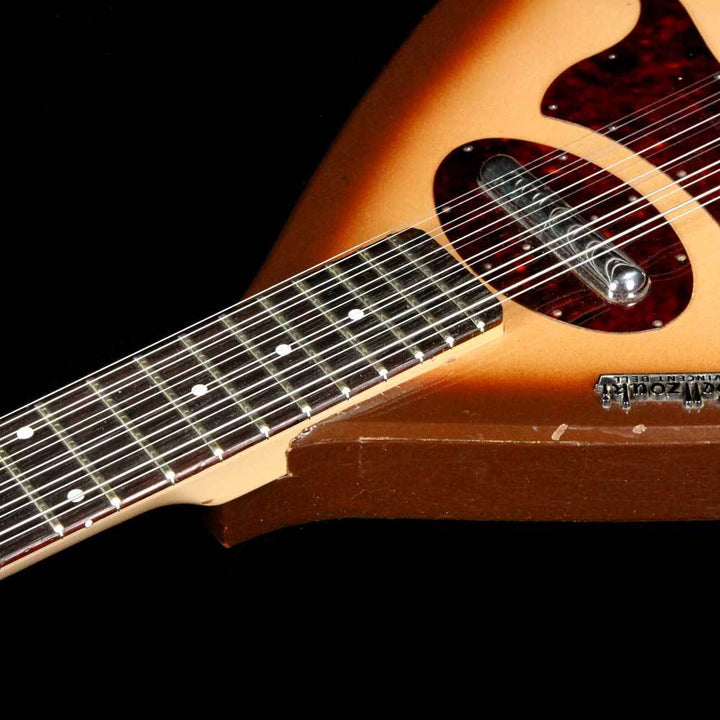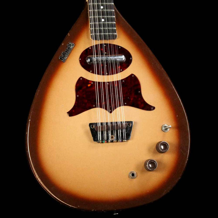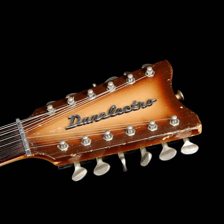 This is a very cool vintage Danelectro Bellzouki - a 12-string Bouzouki which was conceptually developed by 1960's session guitarist Vincent Bell, hence the 'Bell' in 'Bellzouki'. The guitar is built like most other Danos with a masonite body, with a maple neck and rosewood fretboard, with a single lipstick pickup and rosewood saddle. This Bellzouki is in overall good playing condition with some wear around the body, and a non-original gigbag included. A very fun and funky instrument for anyone looking to add something different to their collection!