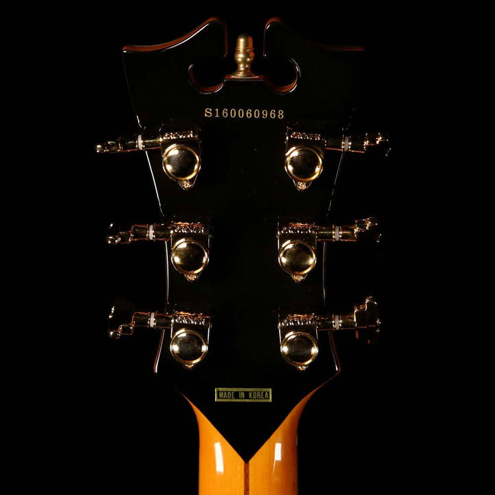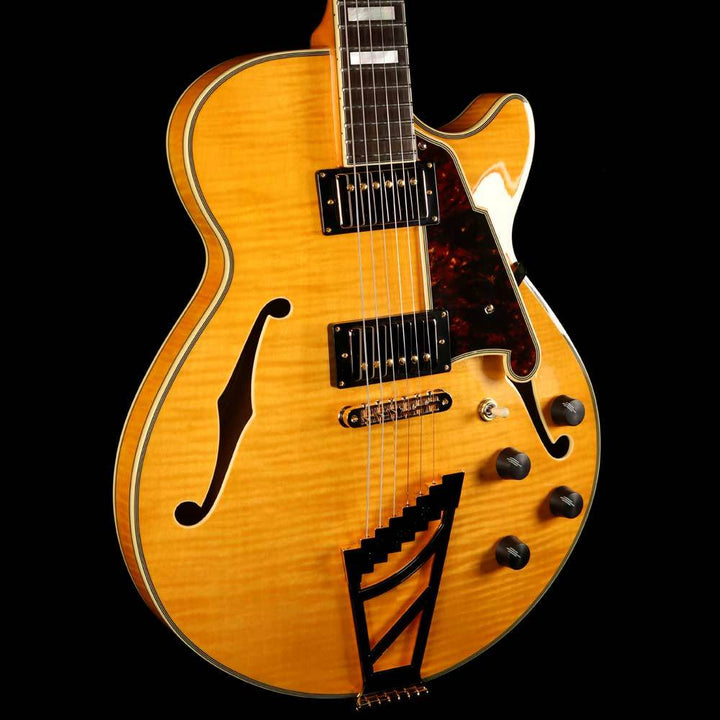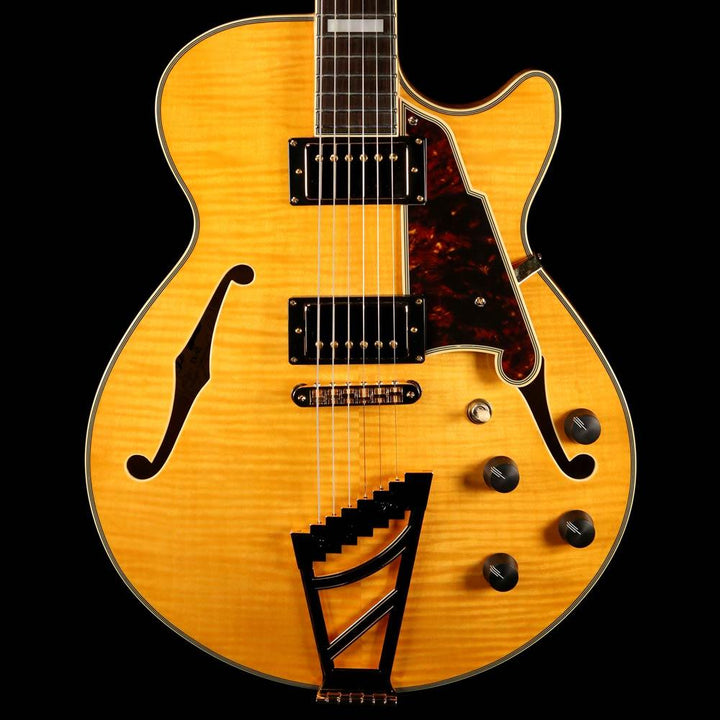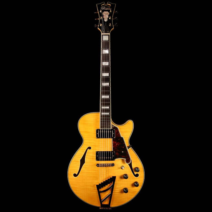 Looking for a quality Jazz guitar at an affordable price? Here's a lightly used D'Angelico EX-SS guitar with a natural finish, in overall excellent shape with the original case included! The EX-SS model is classy looking semi-hollowbody made from laminate flame maple, with a two piece maple neck with a center stripe. The ebony fretboard has 22 frets with split block inlays. Two Kent Armstrong Vintage Humbuckers give crystal clear articulation, and the wooden deco style volume knobs and aluminum stairstep truss rod cover are tasteful accents. Schaller strap buttons have been installed on this guitar for added security while playing with a strap!