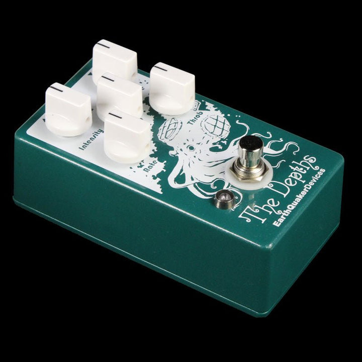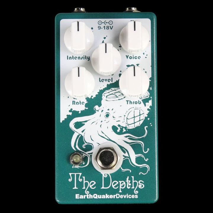 This is The Depths from EarthQuaker Devices. The Depths is EathQuaker's take on the classic optical vibe circuit. In addition to the classic vibe controls, the Depths features unique controls for “Voice” and “Throb.” The “Voice” control adjusts the midrange focus and the “Throb” knob adds a hefty subharmonic low-end pulse to the vibrato signal. It also features a “Level” control that has tons of output above unity to combat the perceived volume loss of most vibe pedals. The Depths can be powered with the classic 9v or at 18v for a stiffer tone with more headroom and sparkle.