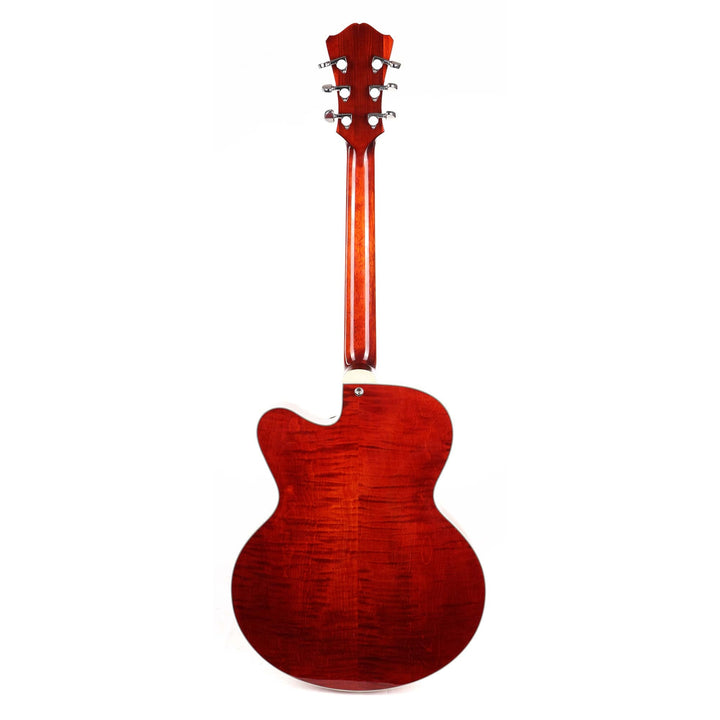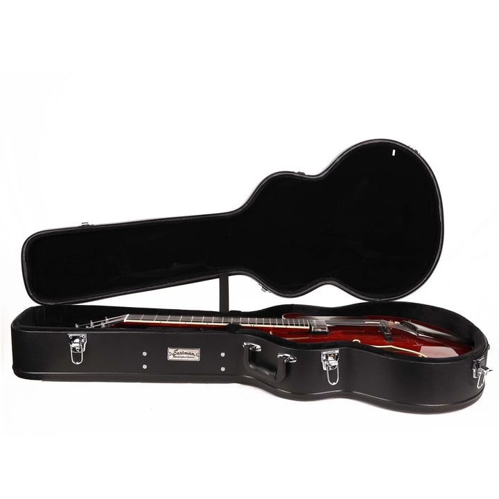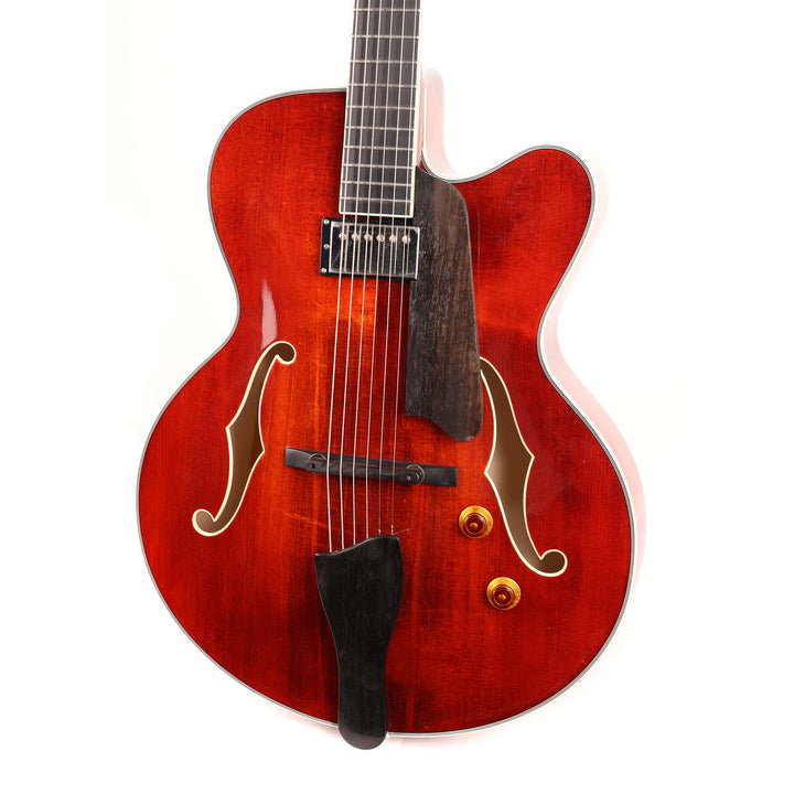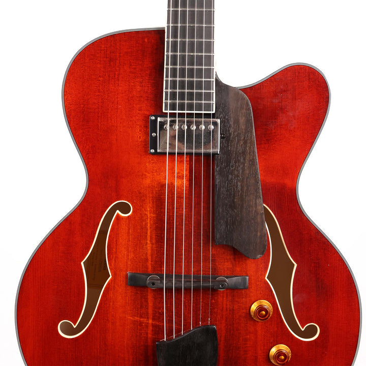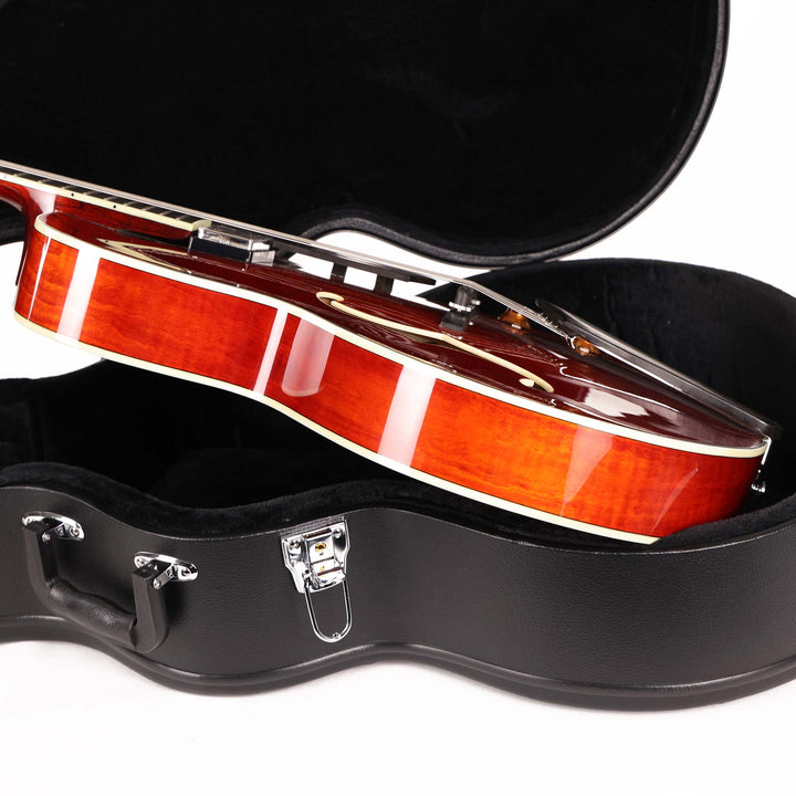This is the AR503CE Archtop Hollowbody by Eastman Guitars with a Classic finish. The guitar has a traditional hollowbody construction via the solid spruce top with a laminted flame maple body, and a 3-piece maple neck paired to an ebony fretboard. A single Seymour Duncan Seth Lover humbucker is in the neck positiion for clean and articulate tones, and the guitar has classic looks with multi-ply body binding and an ebony bridge with a matching ebony over brass tailpiece.