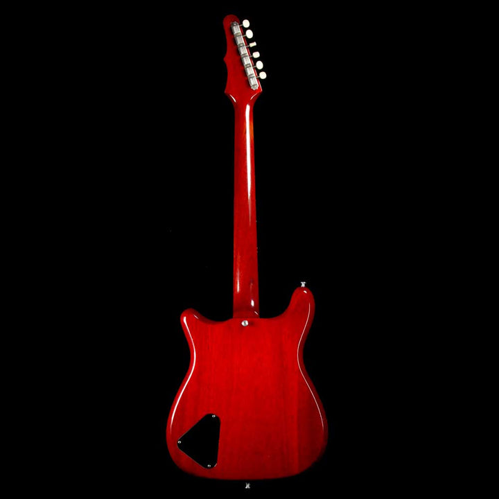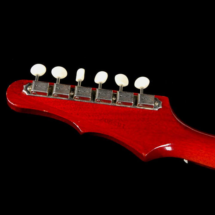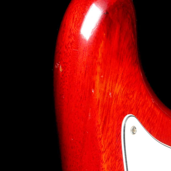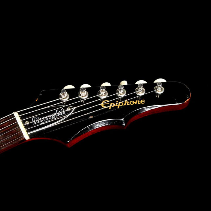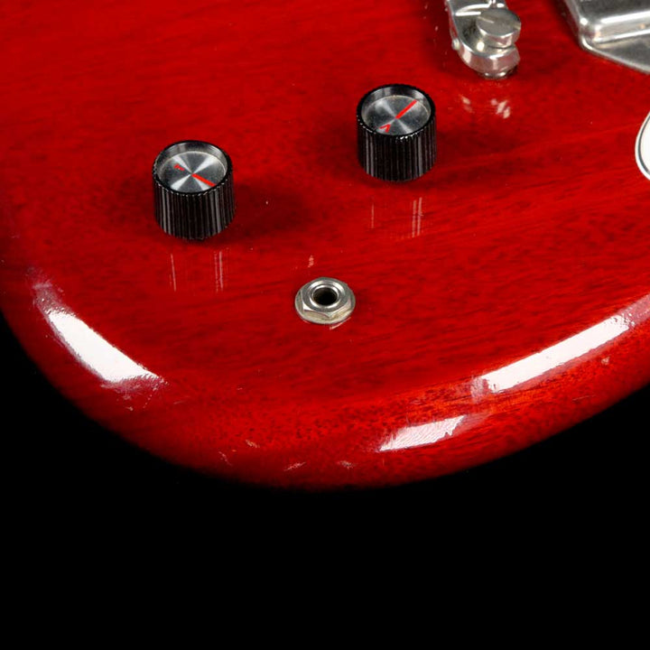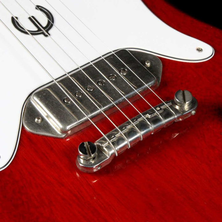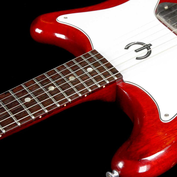 Here we have a fantastic Epiphone Coronet in a cherry finish, built in 1962. The guitar pumps out a rich and chunky P-90 tone through the single pickup combined with a wraparound bridge, rosewood fretboard, and simple yet effective volume and tone controls. With the exception of the "E" on the pickguard, the guitar is original and still plays wonderfully. There is a bit of players wear around the body, no major areas of finish removal or any gouges in the finish. It includes a vintage chipboard case.
