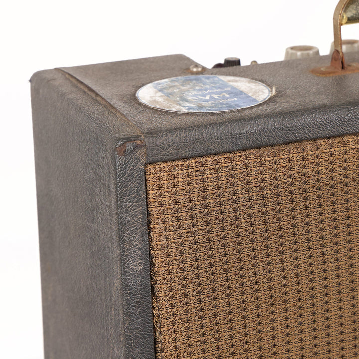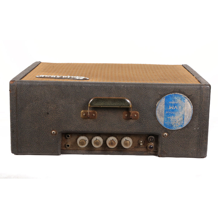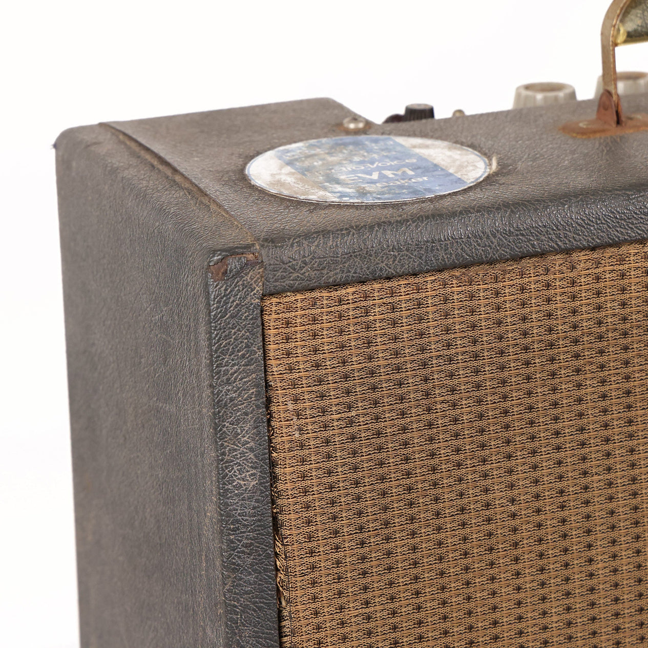 This Epiphone Devon Tremolo has a warm sound and you can hear the full break up around 11:00 on the volume knob. This amp features a 10 inch speaker and a two prong power cord. The amp shows a fair amount of wear and a rusty control panel. The footswitch for the tremolo is hardwired, however the tremolo circuit should be serviced as it works only intermittently.