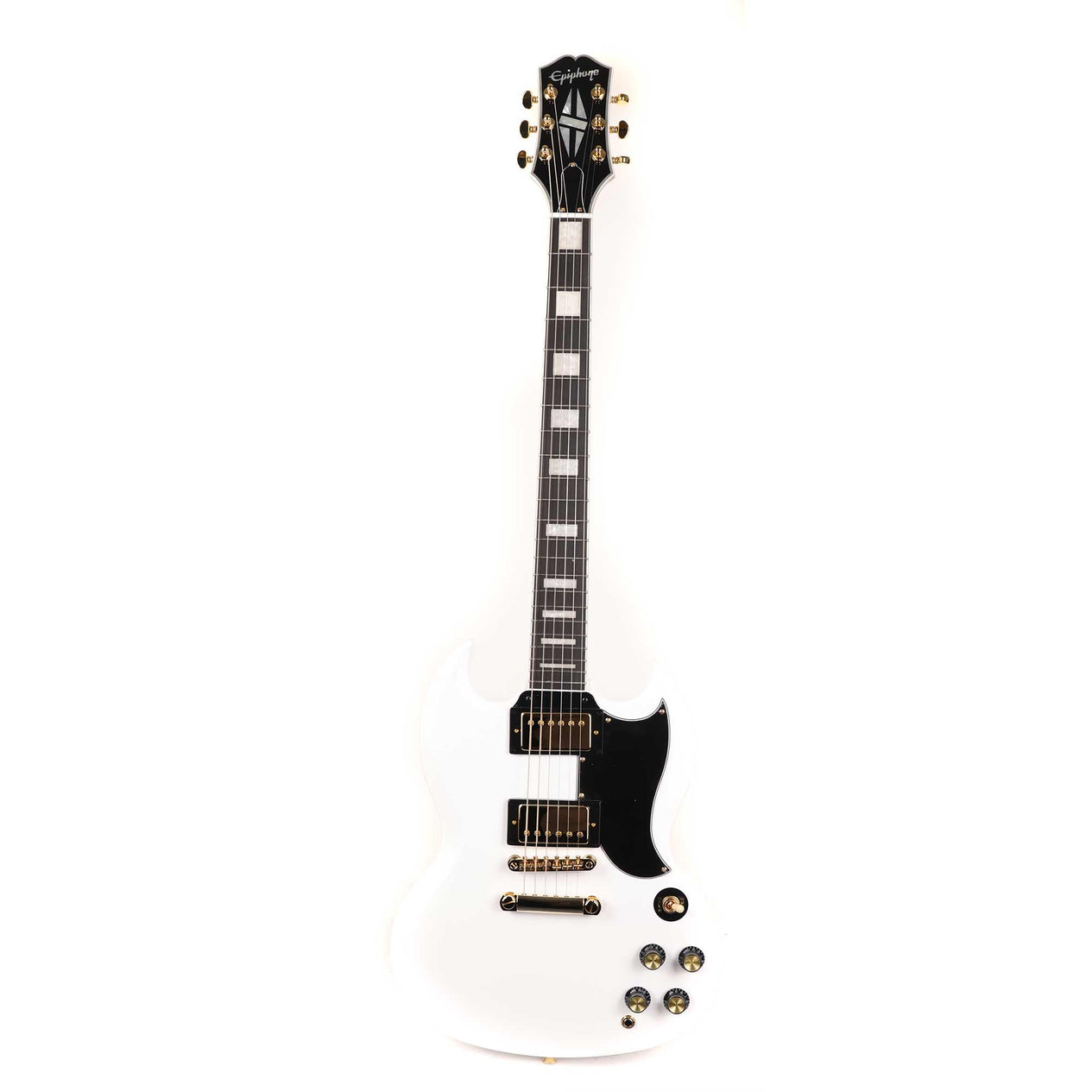 This lightly used SG Custom is part of Epiphone Inspired by Gibson Collection and is a dressed-up "tuxedo" version of the workhorse SG design. Featuring a traditional SG-style Mahogany body and Ebony fingerboard, gold hardware, critically acclaimed ProBucker humbuckers with CTS electronics, Grover machine heads, and Custom style inlays.