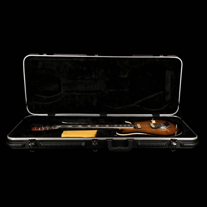 This is a gorgeous Music Man BFR Axis guitar, used but still in overall excellent condition with only light marks around the body. It’s finished in Butterscotch Burst over a flame maple top, with a block inlaid and bound ebony fretboard over a roasted figured maple neck! The guitar has two custom DiMarzio humbuckers, with Music Mans own fine-tuner tremolo for deep dive-bomb action. The original hardshell case is included.