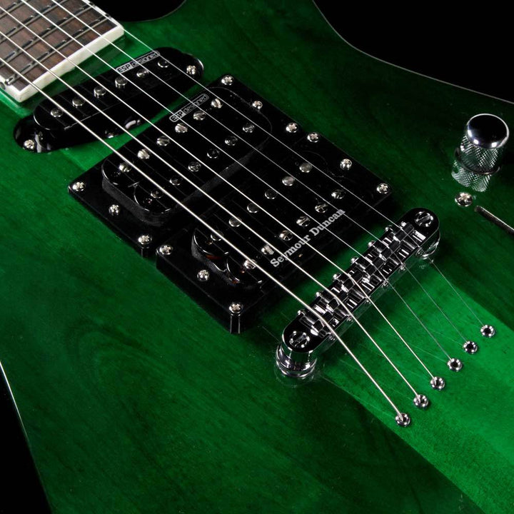 This is the new for 2018 SC-20 model from ESP LTD, a guitar to celebrate the 20th anniversary of ESP Stephen Carpenter signature guitars! This neck-through model has a see-thru green finish, alder body with a maple neck, two humbuckers with an angled single-coil pickup in the neck, and 5-way switch! Other features include a thin “U” neck profile, a Tonepros locking Tune-o-Matic bridge, locking tuners, and chrome hardware. With its unique pickup layout, the guitar has a look and feel like nothing else.