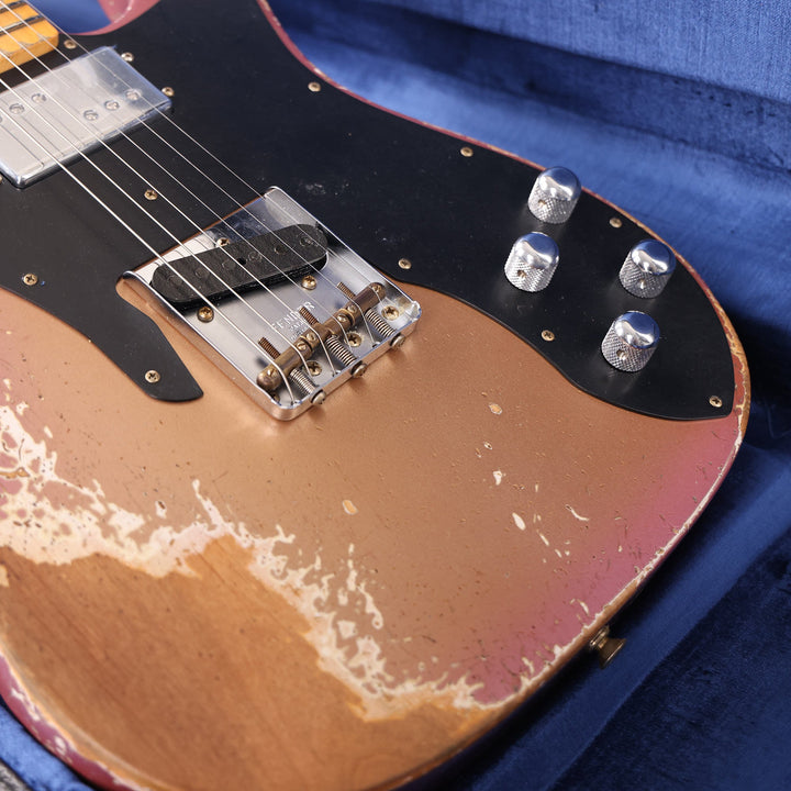 Here's a very cool Custom Shop Telecaster with a Limited Edition finish you won't find too often! This is a limited edition Tele Custom finished in Aged Twilight Sky - which is combination of Aged Firemist Silver with Aged Candy Tangerine Burst and given a Super Heavy Relic treatment! The guitar has a CuNiFe Wide Range humbucker in the neck combined with a Handwound Crushed Blackguard Tele pickup in the bridge. The knurled dome knobs add a nice touch to this very cool Tele!