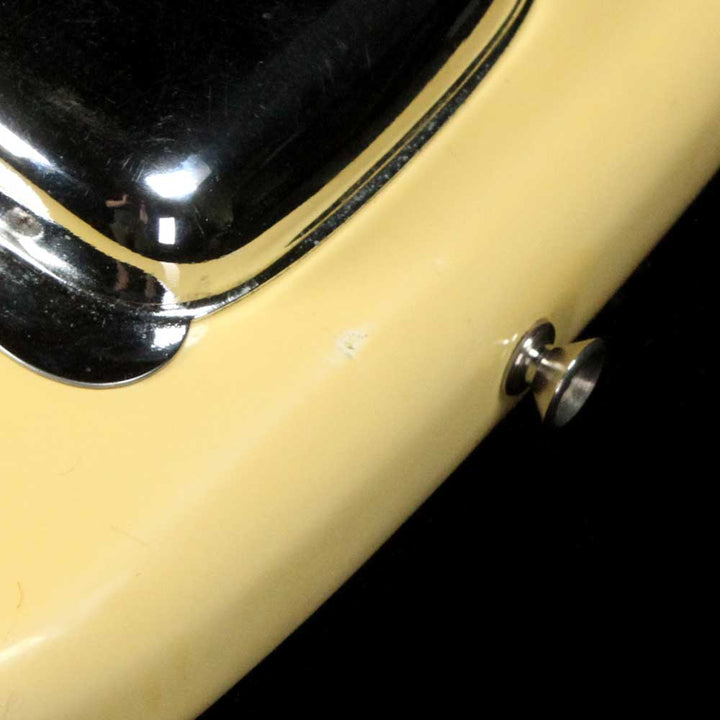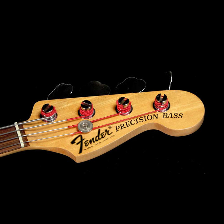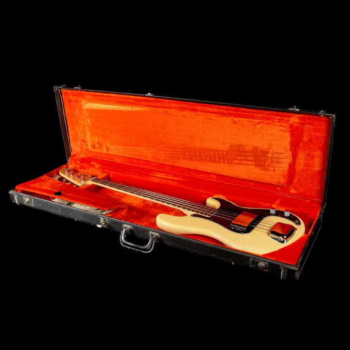 This 1977 Fender Precision Bass boasts a perfectly aged Olympic White finish and is all original - aside from a new nut and pro refret which gives this bass playability to match it's vibe! This one was also factory ordered with an "A" neck, with a 1.5" (1-7/16") nut width. Other features include the alder body, original split coil pickup, Fender tuners and bridge, and a black pickguard. It's in very good condition for it's age with normal wear for a vintage instrument, with only a couple noticeable finish chips and a small crack in the pickguard. It weighs in at 9 lbs 6 oz, so it's fairly light considering it's era.
