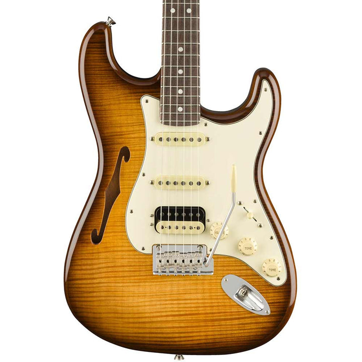 The new for 2019 Fender Rarities collection combines exotic tonewoods with premium Fender pickups and player-friendly specs to make some very special Limited Edition instruments. Here's the Thinline Stratocaster HSS topped with flame maple and a gorgeous rosewood neck!