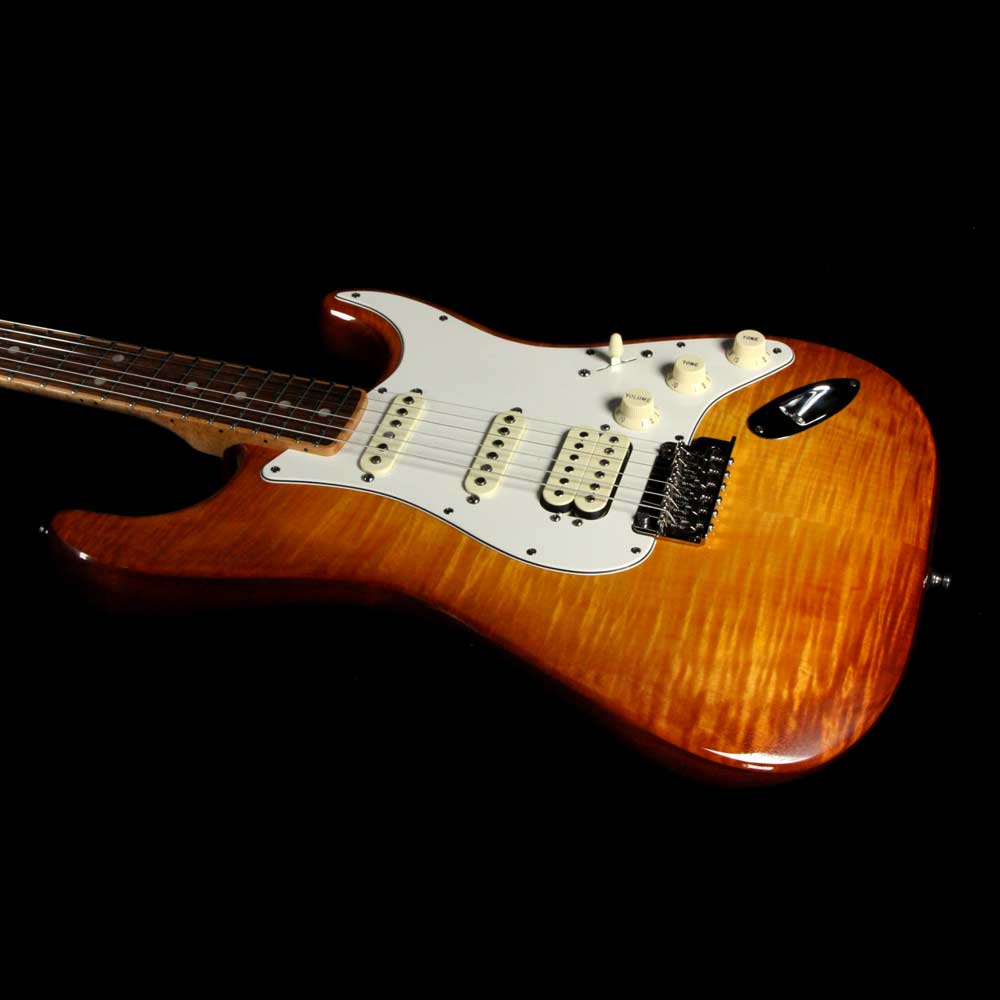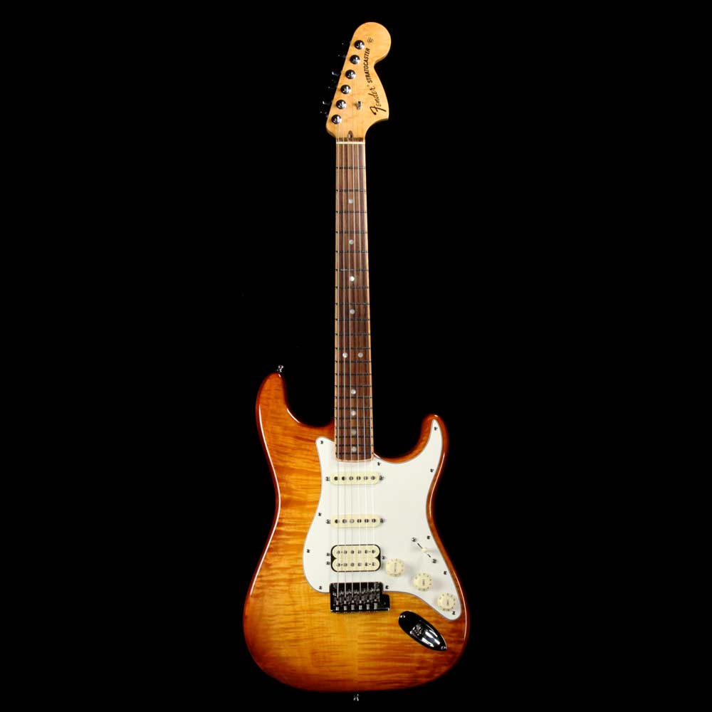 Here is a pre-owned Fender Select Strat in a slick looking Tobacco Sunburst finish, built in 2013. The Select Series not only gave us Strats with great flame tops, but the introduction of the unique channel bound rosewood board, where the rosewood was inlaid into the maple neck. Other features include a compound 9.5-14” fretboard radius, three single-coil Strat pickups, and a 2-point tremolo. This Select Strat is in excellent condition with no major signs of wear to be seen on it, and the original case with case candy included!