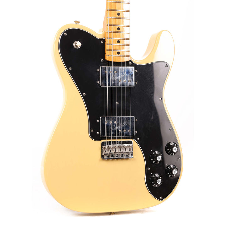 This is a used 2022 Fender Vintera series '70s Telecaster Deluxe with a Vintage Blonde finish and two Wide Range humbuckers. The guitar has light wear around the body including pick scratches on the guard and tarnishing on the hardware as well as pickup covers. No major dents or dings, and the original Fender gigbag is included.