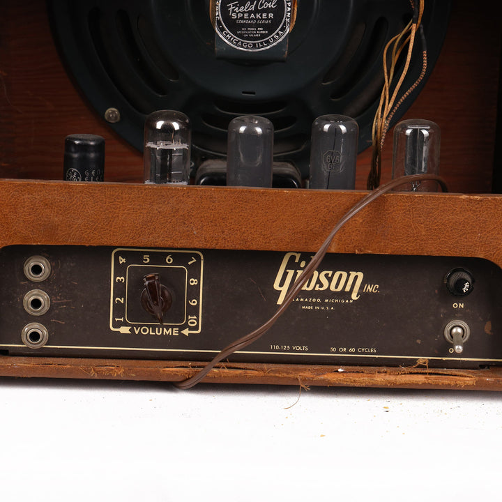 This Gibson BR-6 appears to be an earlier model since the model name is engraved on the transformer. The amp does not really break up until it's fully cranked and even then it sounds like it's on the edge of breakup. the volume pot is a bit scratchy but functions as it should. Inside the amp you will find a 10 inch Jensen field coil speaker. This amp comes with a two prong power cord and we recommend that the next owner change it to a modern three prong cord if it is going to be used regularly.