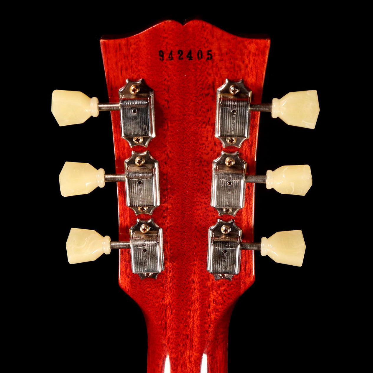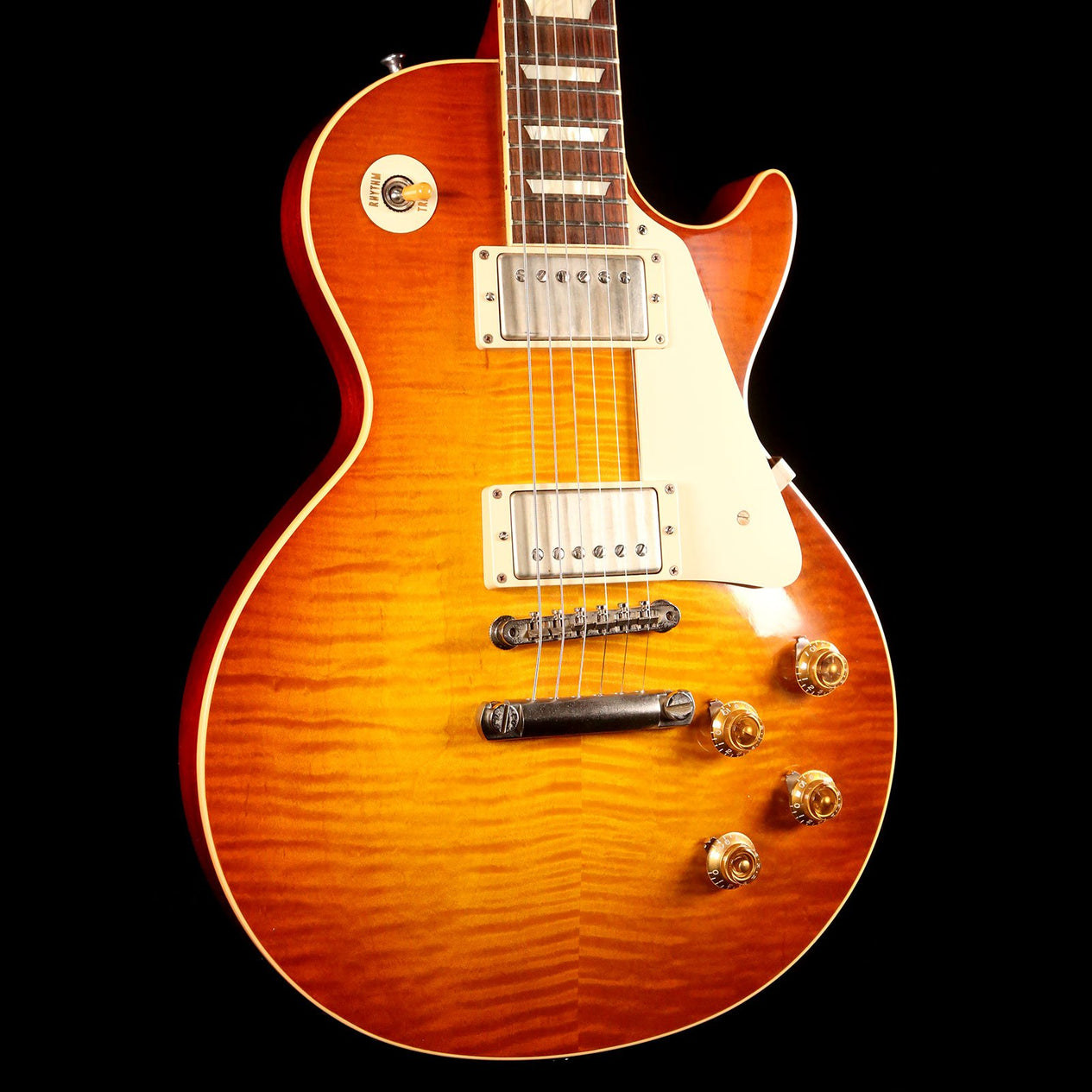 Here's a used and still in excellent condition '59 Les Paul Standard reissue, built by Gibson Custom in 2014 with a sunset tea burst finish. The guitar has some small indents in the wood of the backside edge, and lightly cracked knobs - just light signs of players wear and still sounding great! A little wear like this makes it easy to get right on stage with your Les Paul without worrying about that first mark. The original case and COA are included as well!