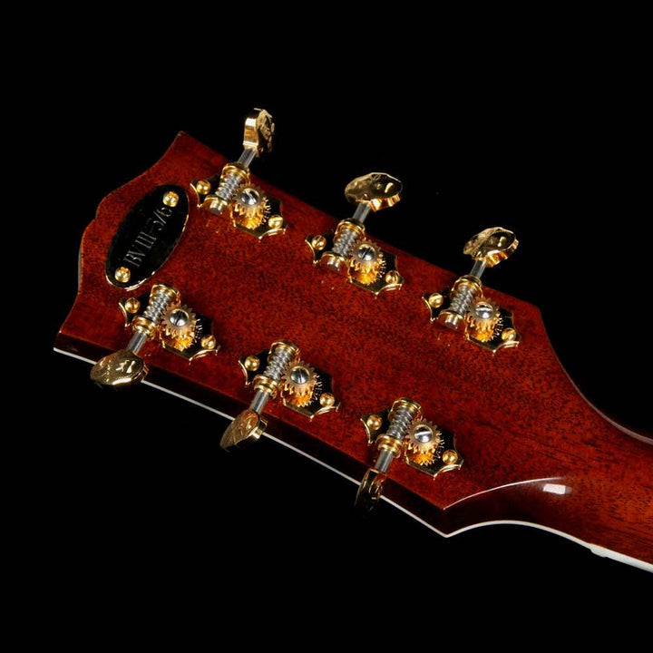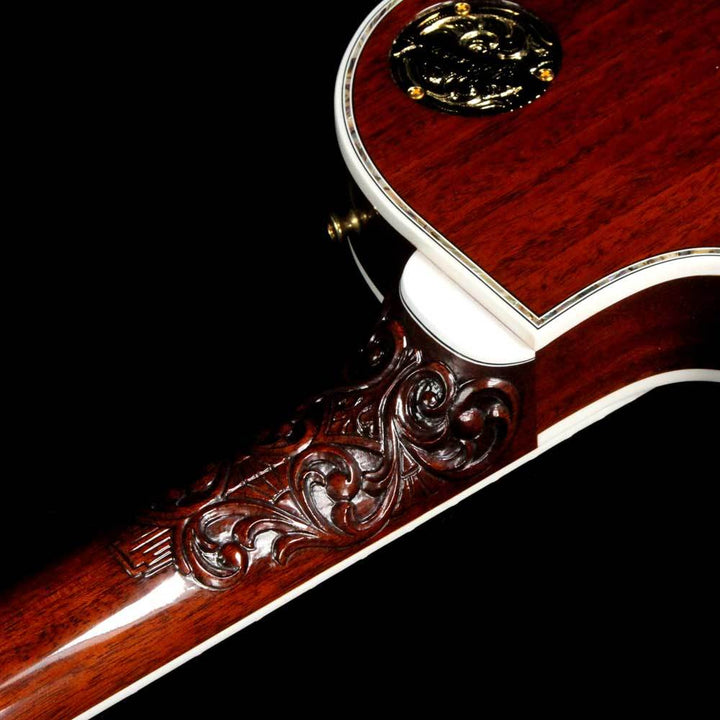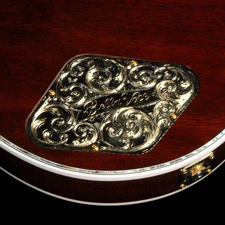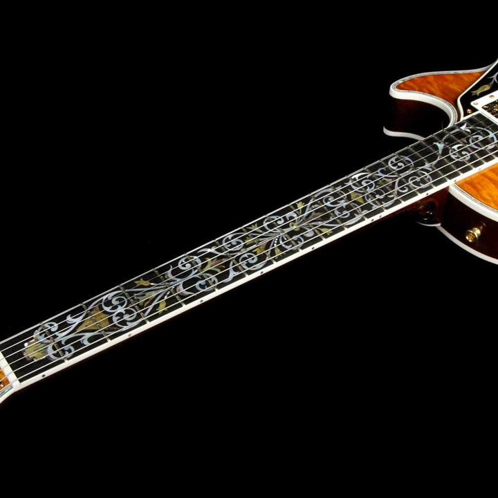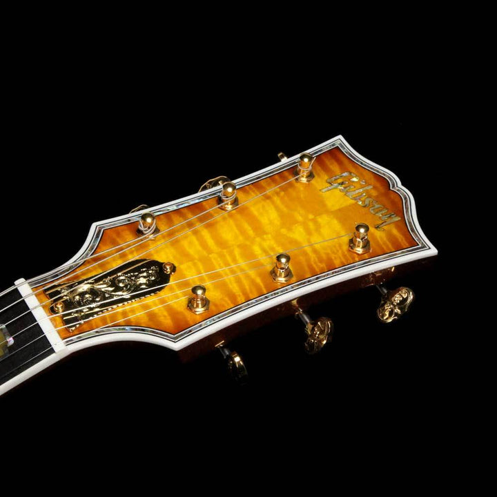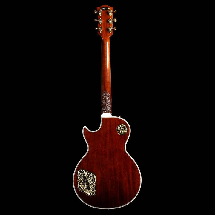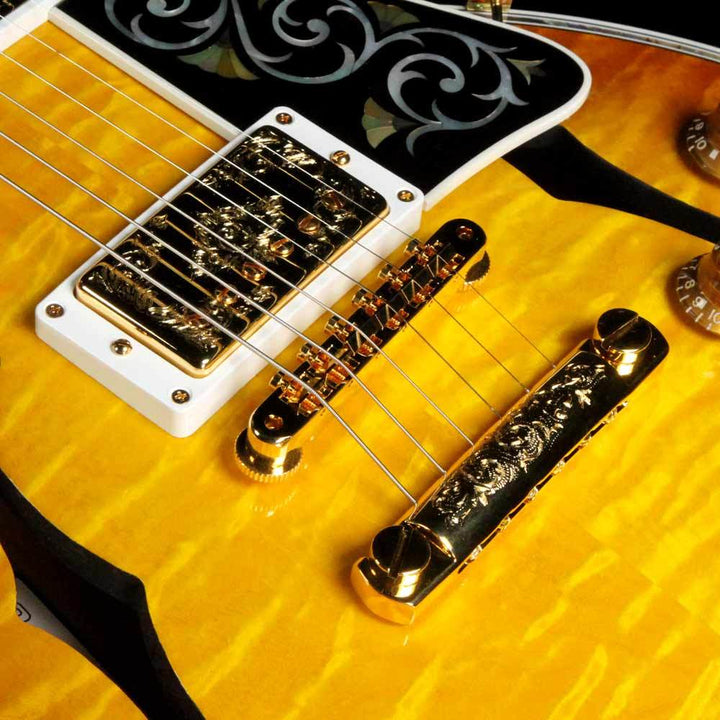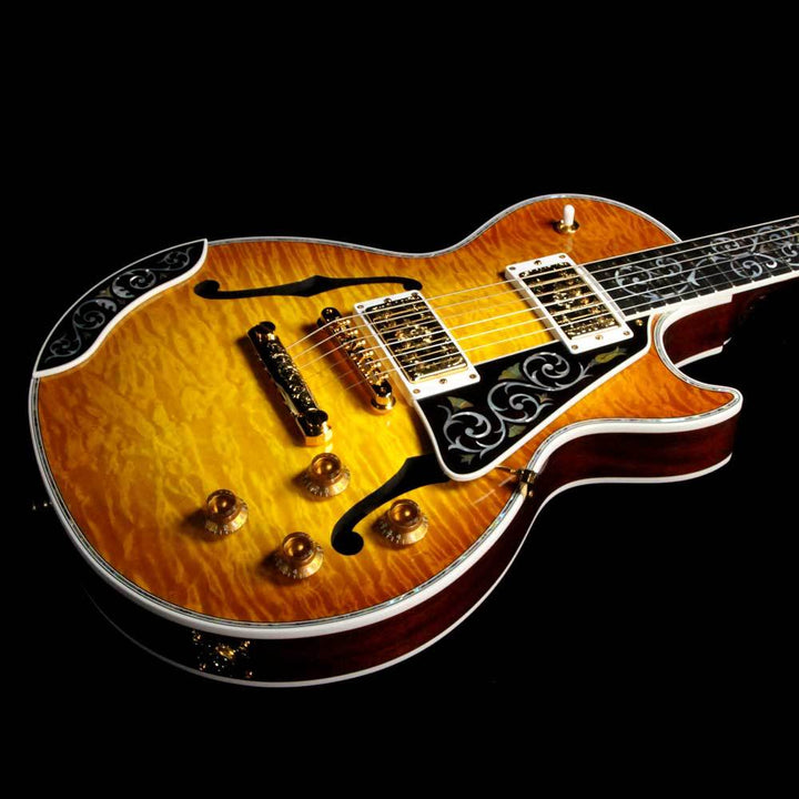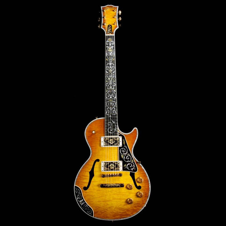 Just as much a work of art as it is a functional electric guitar: this is a one of a kind Gibson Les Paul Bella Voce from the Gibson Custom Crimson division finished in Honey Burst, built with exquisite pieces of 5A-grade quilted maple with F-holes, paired with a chambered mahogany body, along with masterfully engraved metal parts and pearloid/abalone inlay work. The guitars neck heel is carved out with a design by the very talented Bruce Kunkel. The attention to detail really has to be seen in person to be truly appreciated, especially on the smaller metal parts such as the stopbar tailpiece and humbucker covers...even the tuner keys have designs on them! This guitar is in overall excellent condition with little to no wear to be seen on it, and it includes the original hardshell case with certificate of authenticity.