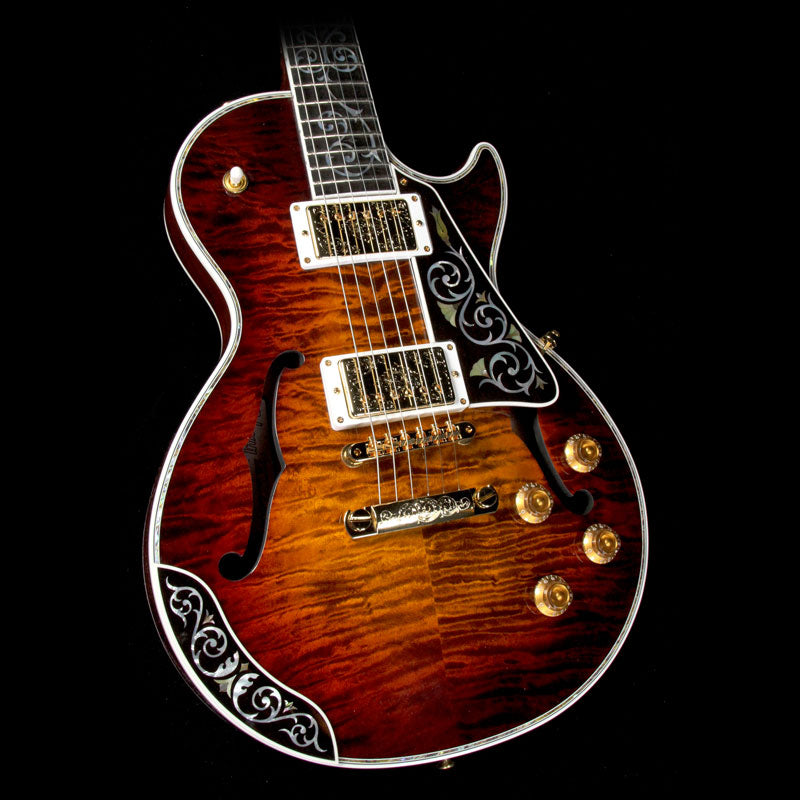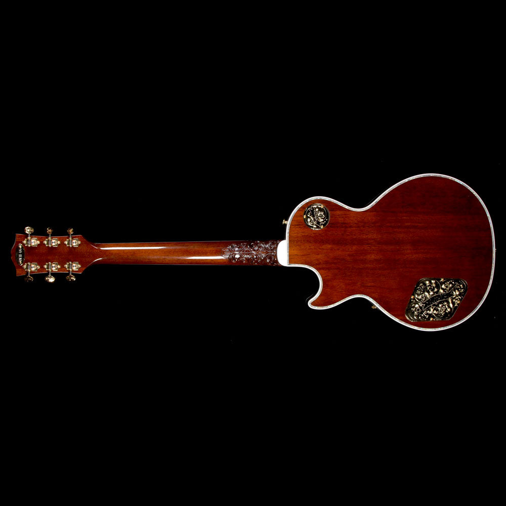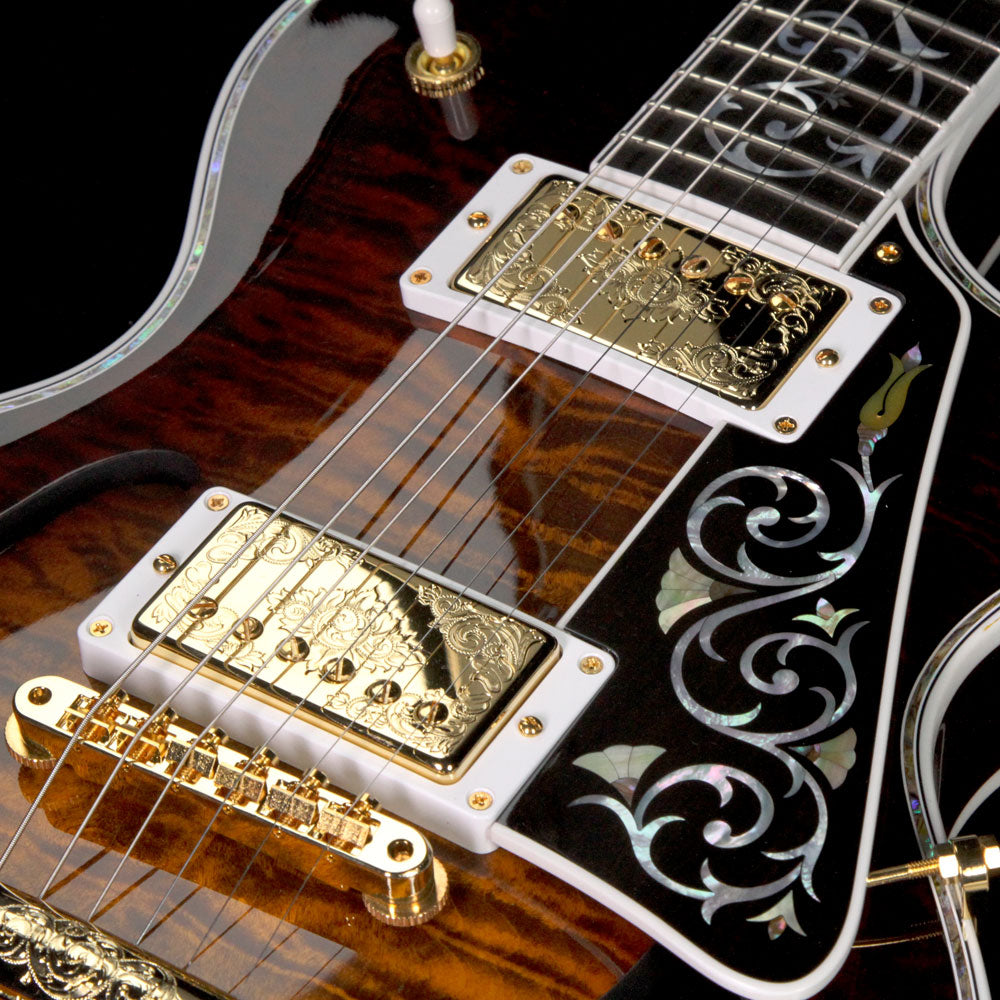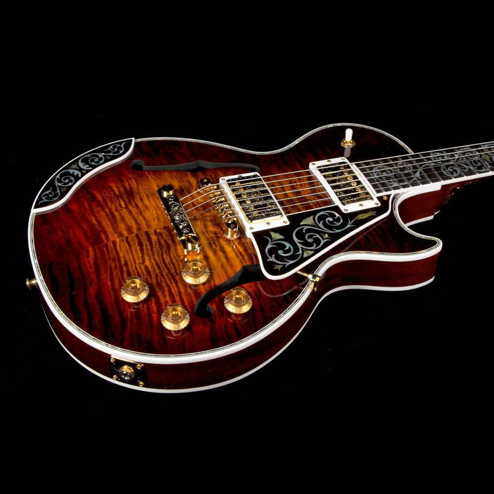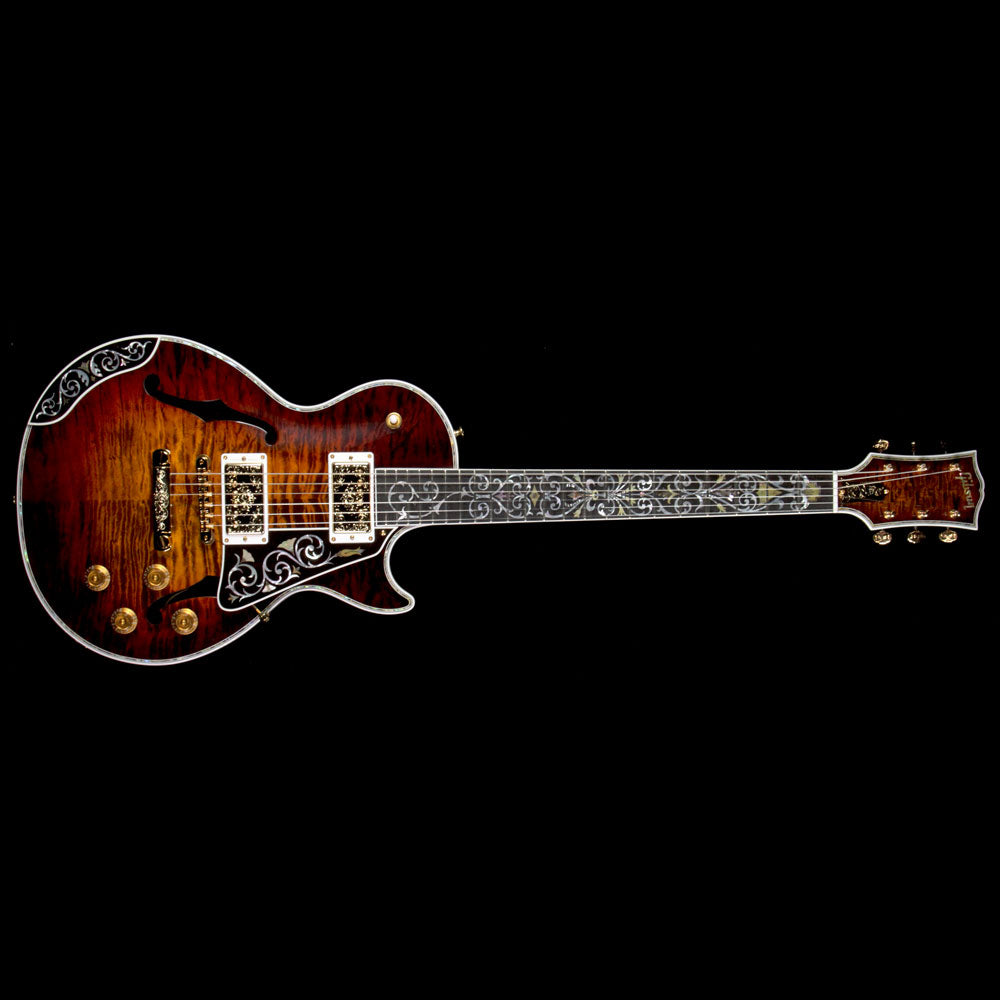 Just as much a work of art as it is a functional electric guitar: this is a one of a kind Gibson Les Paul Bella Voce from the Gibson Custom Crimson division with a Vanessa Brown finish, built with exquisite pieces of 5A-grade quilted maple with F-holes, paired with a chambered mahogany body, along with masterfully engraved metal parts and pearloid/abalone inlay work. The guitars neck heel is carved out with a design by the very talented Bruce Kunkel. The attention to detail really has to be seen in person to be truly appreciated, especially on the smaller metal parts such as the stopbar tailpiece and humbucker covers...even the tuner keys have designs on them!