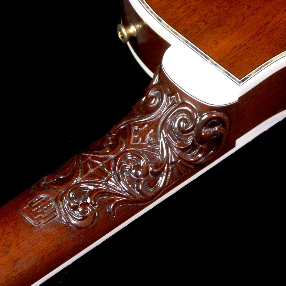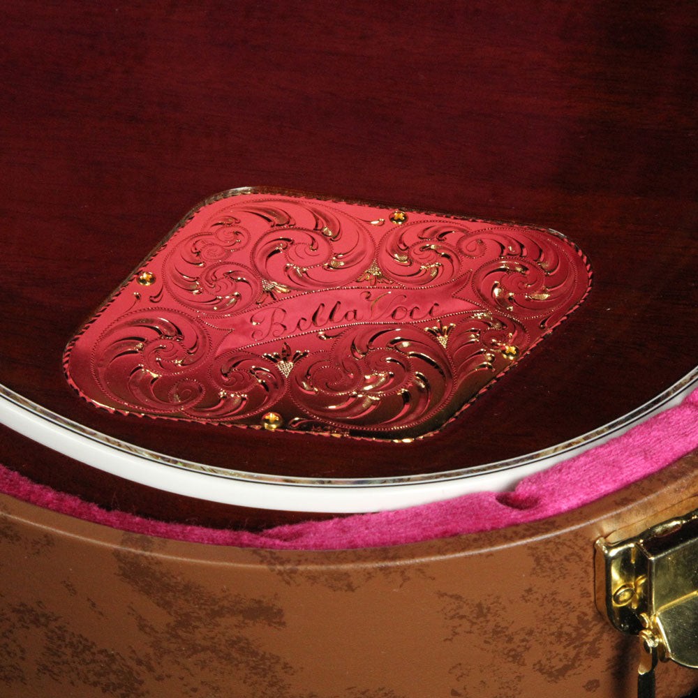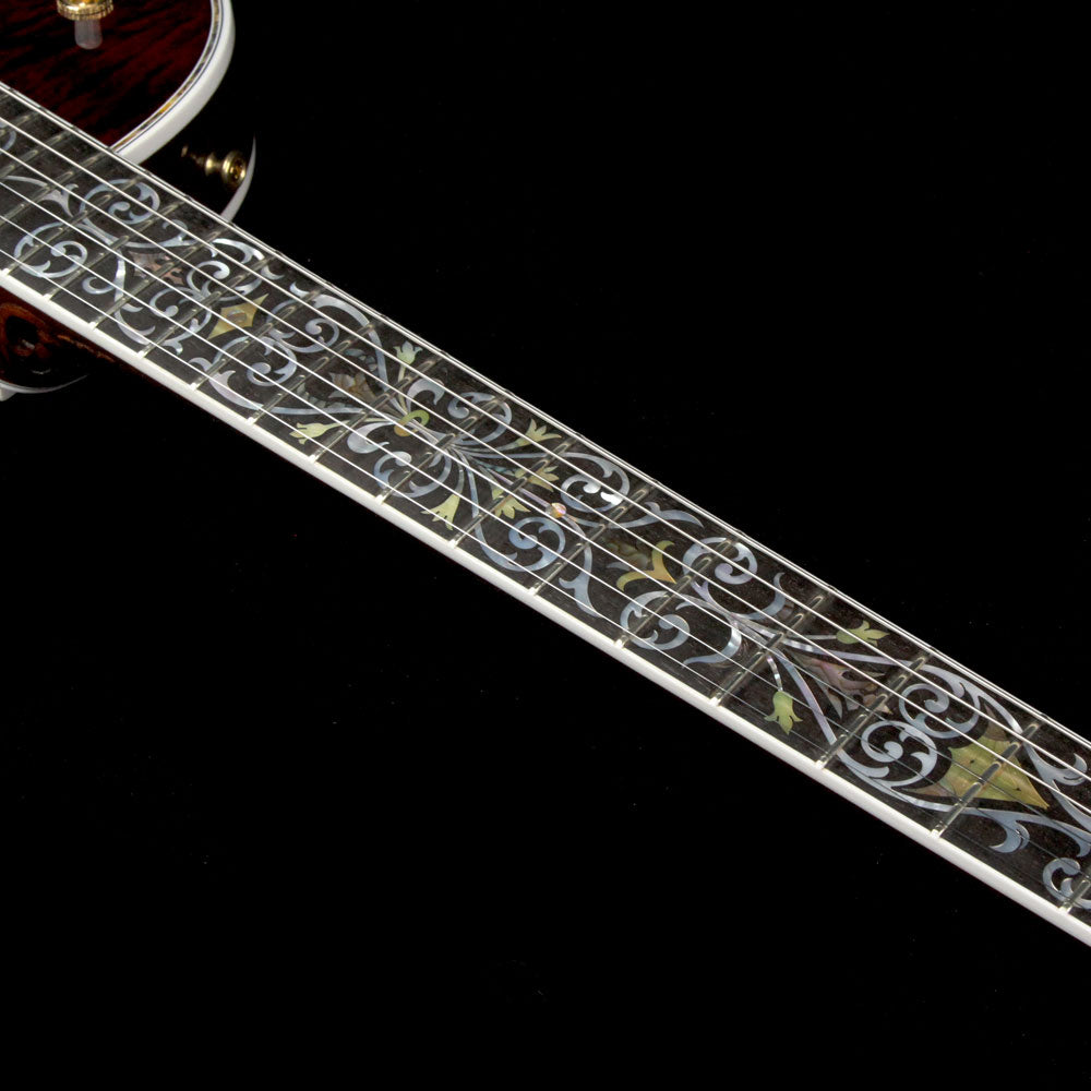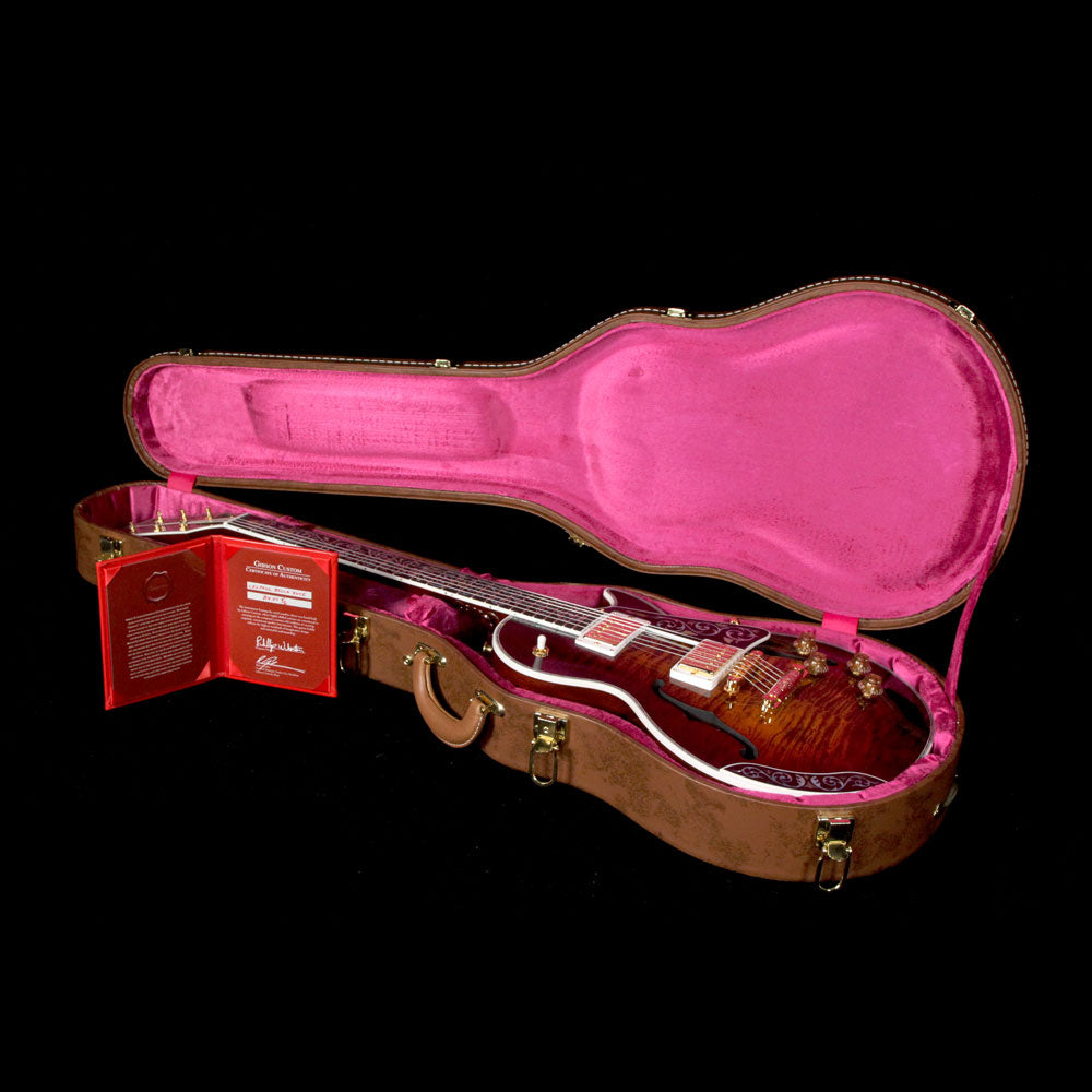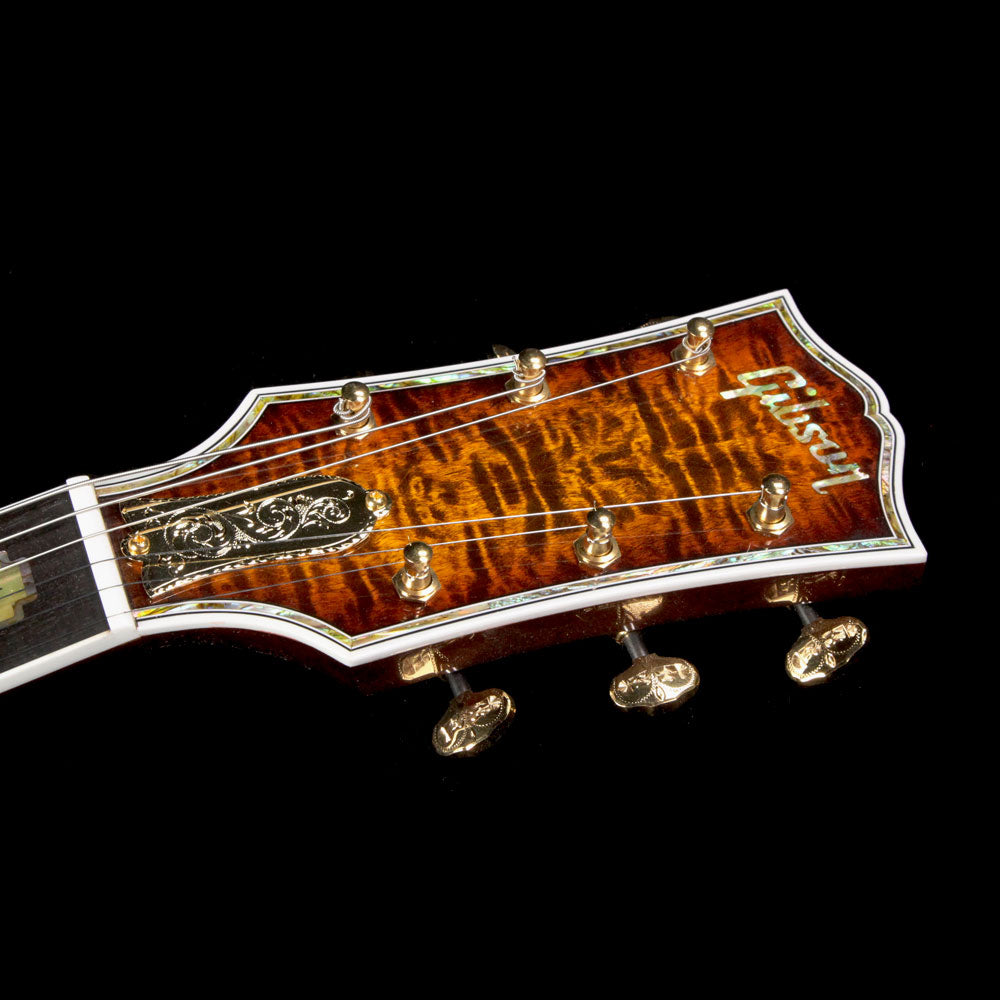 Just as much a work of art as it is a functional electric guitar: this is a one of a kind Gibson Les Paul Bella Voce from the Gibson Custom Crimson division with a Vanessa Brown finish, built with exquisite pieces of 5A-grade quilted maple with F-holes, paired with a chambered mahogany body, along with masterfully engraved metal parts and pearloid/abalone inlay work. The guitars neck heel is carved out with a design by the very talented Bruce Kunkel. The attention to detail really has to be seen in person to be truly appreciated, especially on the smaller metal parts such as the stopbar tailpiece and humbucker covers...even the tuner keys have designs on them!