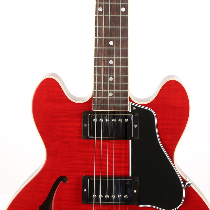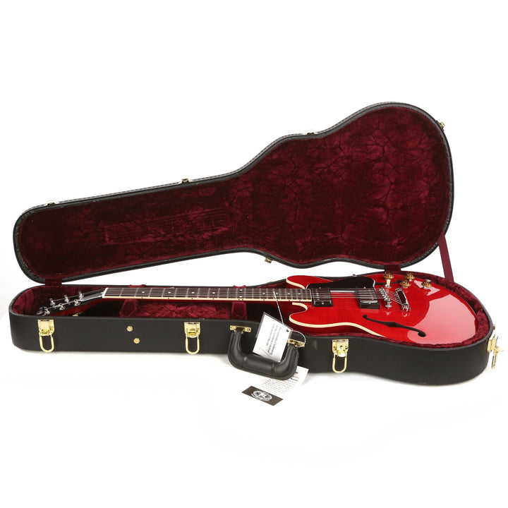 This is a beautiful Gibson Custom Shop CS-336 semi-hollowbody guitar with a Faded Cherry finish! The CS-336 is a bit different than the ES-335 in that it's firstly a smaller body size, and second it has a mahogany back and sides as opposed to the maple of a 335, adding a midrange warmth to your tone. The pickups are a set of '57 Classic humbuckers: some of our favorites for a versatile tone that covers Jazz to a thick, dirty Blues or Rock sound! If you want a Gibson semi-hollow without a cumbersome size, the CS-336 Figured Top is a great choice.