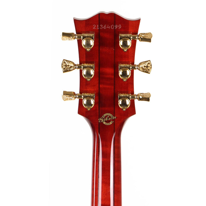 This is the incredibly ornate Gibson Doves in Flight model, built in Montana with an incredible wood set of figured maple, and adorned with Doves in Flight inlays and a hand painted pickguard. The guitar has a rock-solid 3-piece maple neck and an ebony fretboard. The Doves in Flight displays 28 individually engraved dove inlays—seven on the headstock, 16 on the fingerboard, three on the pick guard, and two on the bridge—each with its own original design. Each tuner knob is hand engraved for full detail!