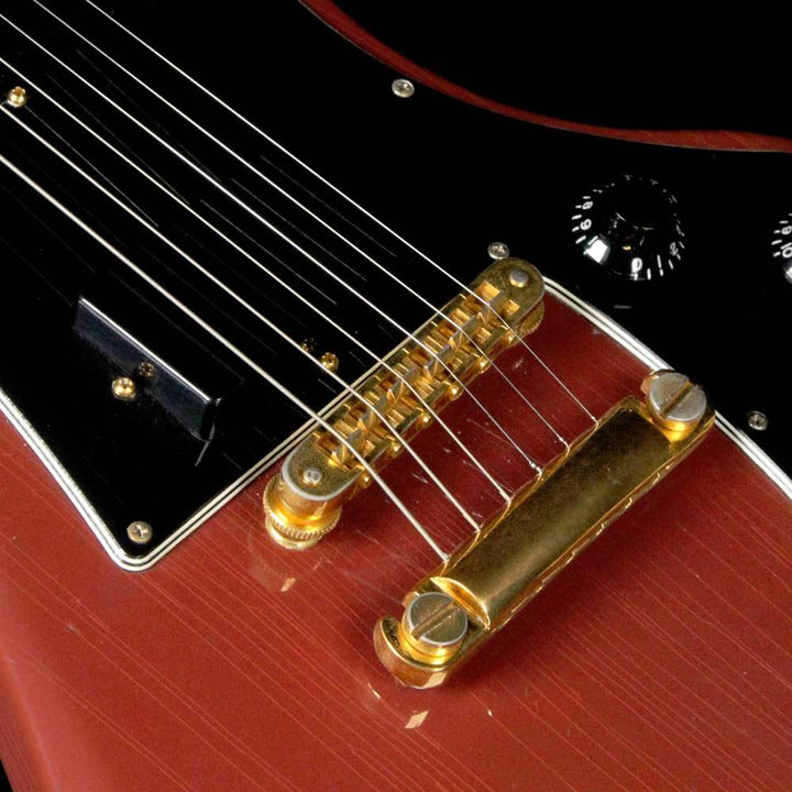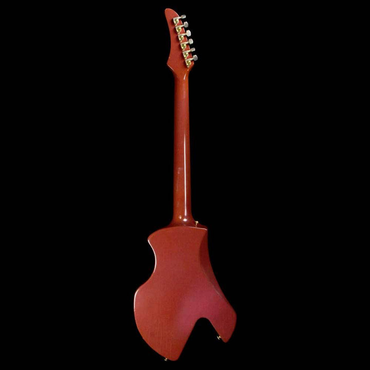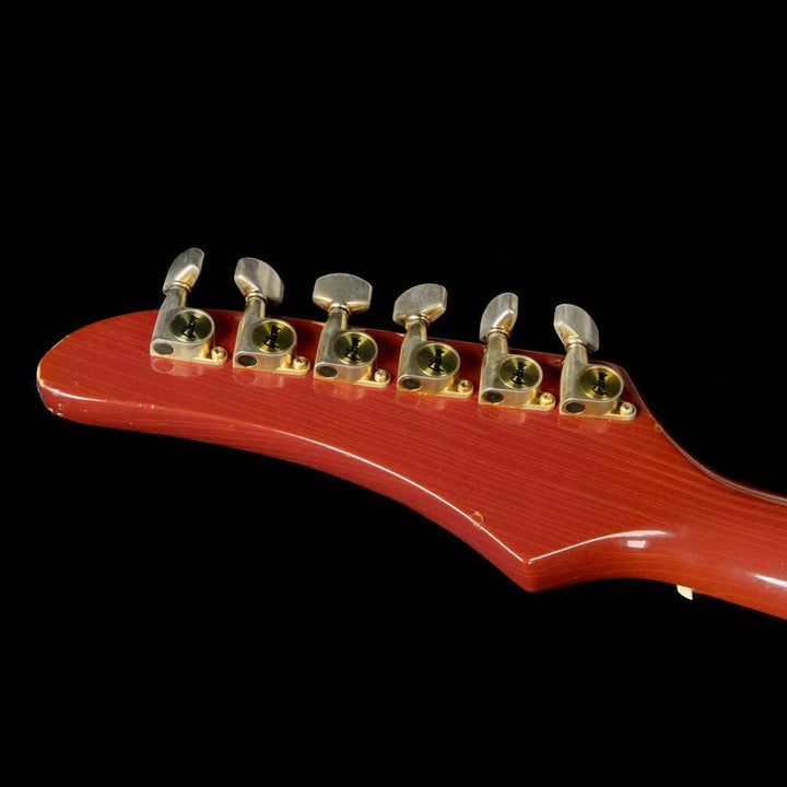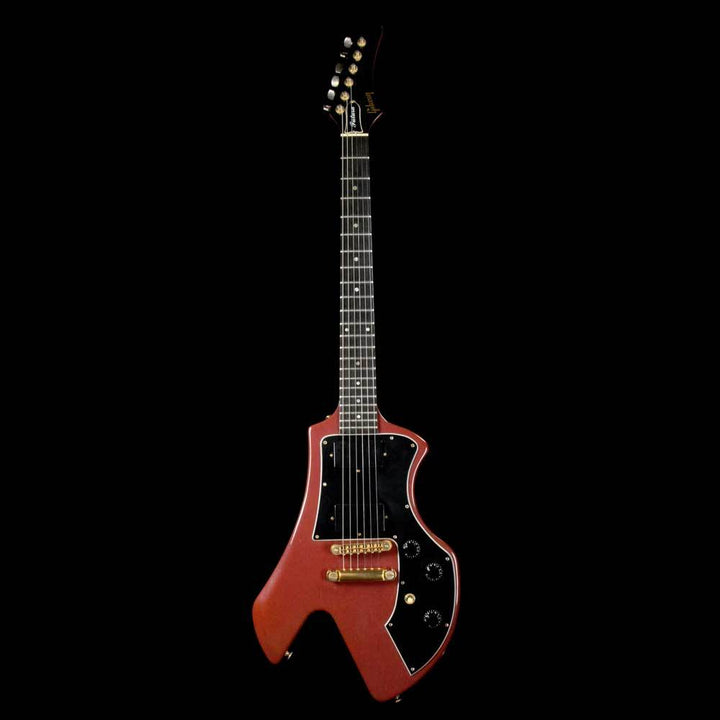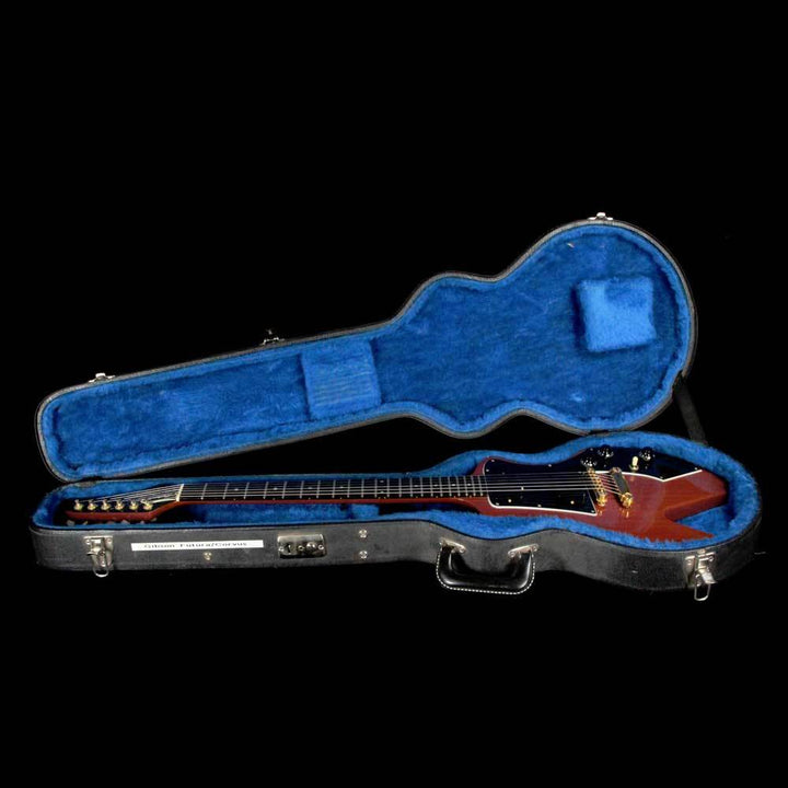 Released in the 1980's as a neck-through version of the Corvus, this is a used 1984 Futura in the Ultraviolet finish which has faded over time to almost look like a Burgundy Mist or something similar. The guitar has a 22-fret ebony board with dot inlays, two covered Gibson humbuckers, and a stopbar tailpiece. There is lacquer checking throughout the body, with players wear such as small dings. A 3rd strap pin was installed, giving you the choice of what is most comfortable for you to wear the guitar. The original case is included as well.