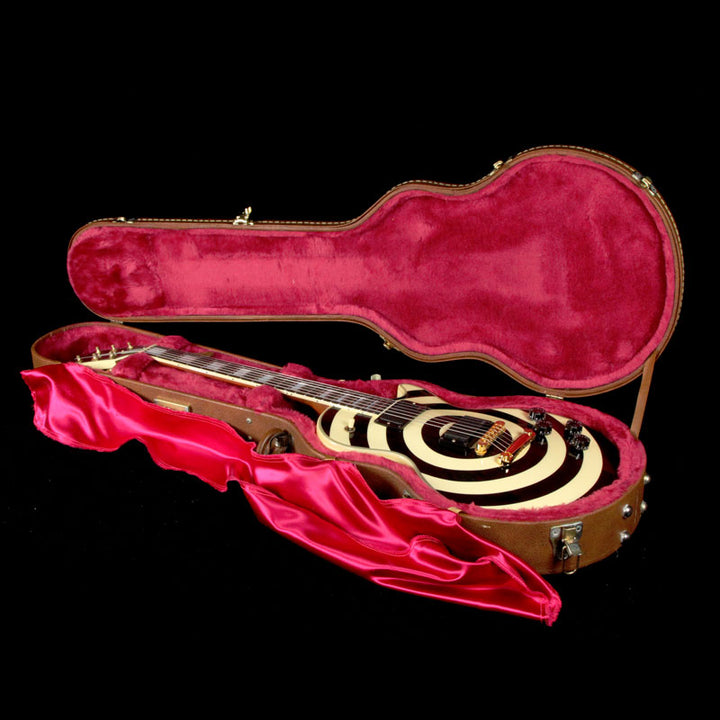 Here's a fun Les Paul Custom, built in 1998 and refinished aftermarket by GMW with a Zakk Wylde inspired Bullseye finish! The guitar has a maple cap over a solid mahogany body, mahogany neck with ebony board and block inlays, split diamond headstock inlay, and EMG 81/85 active humbucker pickups. The guitar has slightly rough feeling paint by the neck heel, tarnish to hardware as well. All in all a great playing Custom with the original case included.