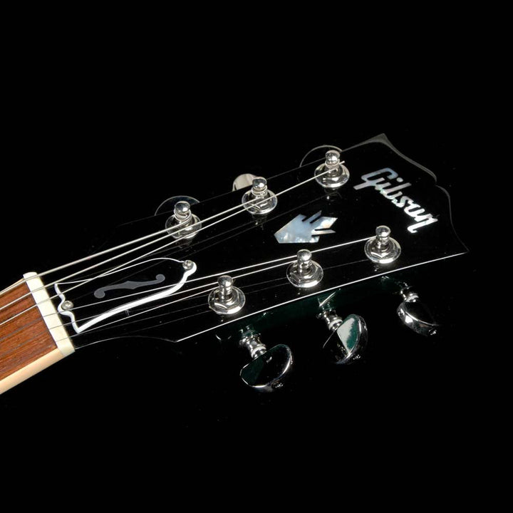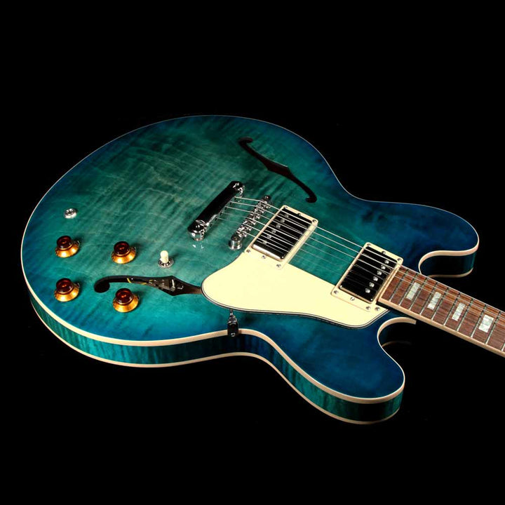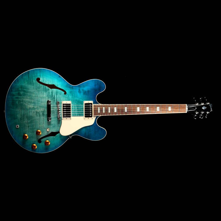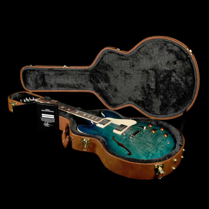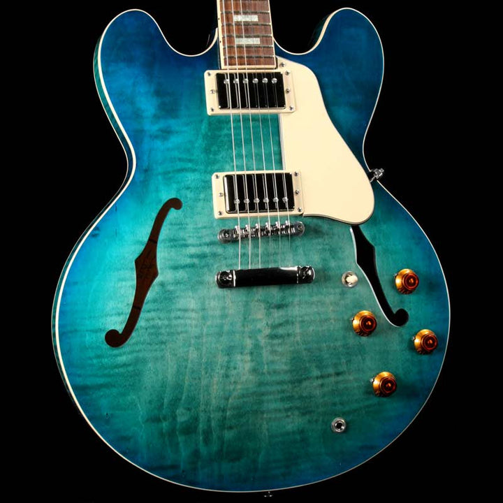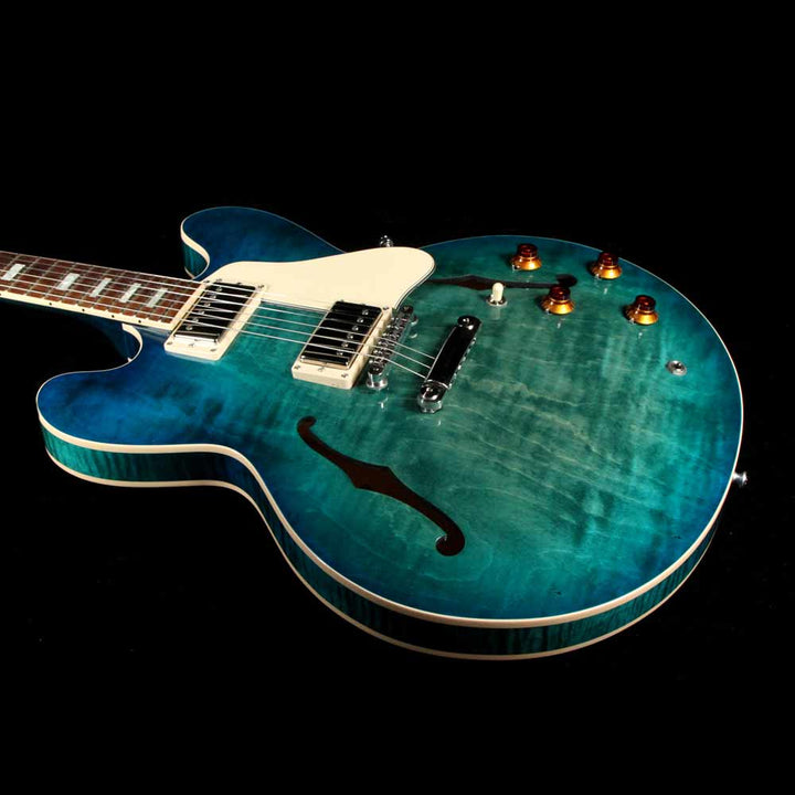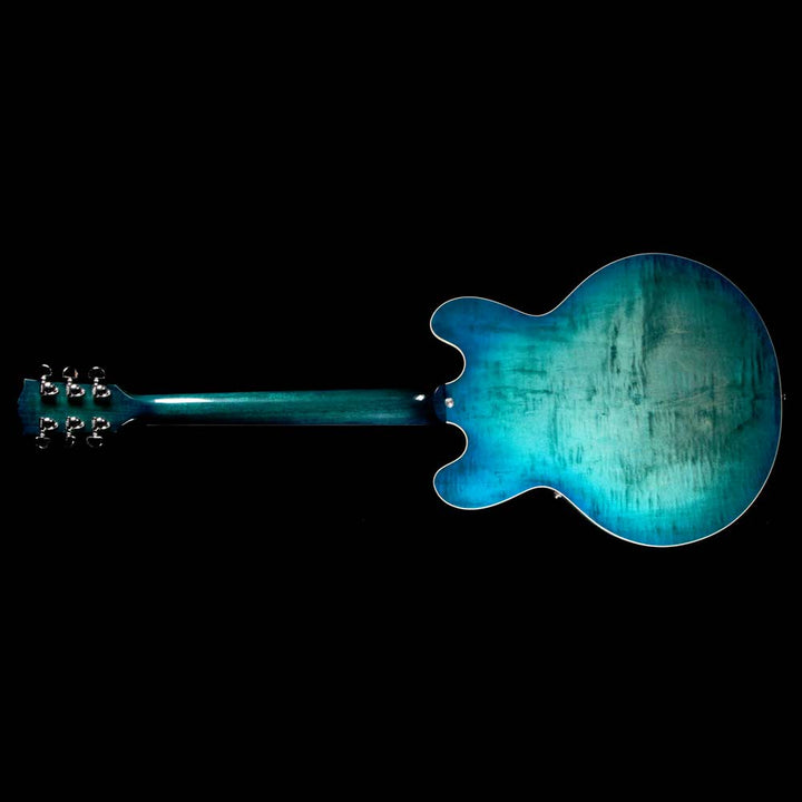 This Gibson ES-335 Figured boasts a stunning new Aquamarine finish for 2018! An "elevated" 335, this Memphis made Figured semi-hollow features a 3 ply maple/poplar/maple body with AAA maple top, a quartersawn "Rounded C" profile mahogany neck, bound rosewood fingerboard with small pearl block inlays and rolled binding, Custom Shop MHS Rhythm and Lead humbuckers with MTC Premiere electronics, titanium saddle ABR-1 bridge with lightweight aluminum stoptail, and Grover Rotomatic tuners.