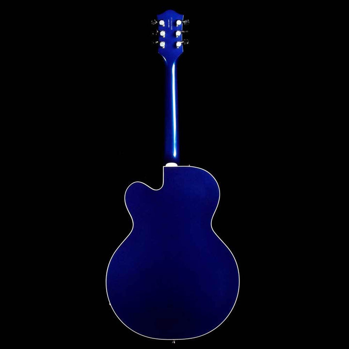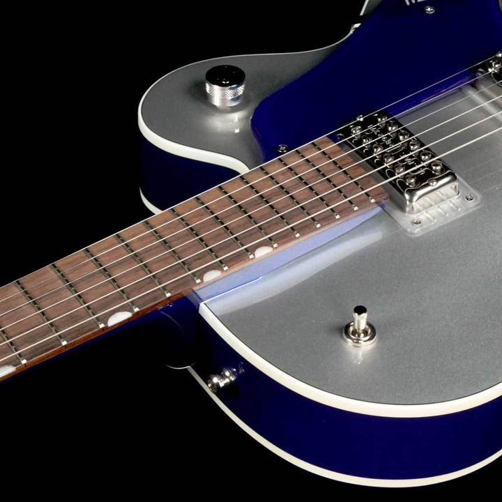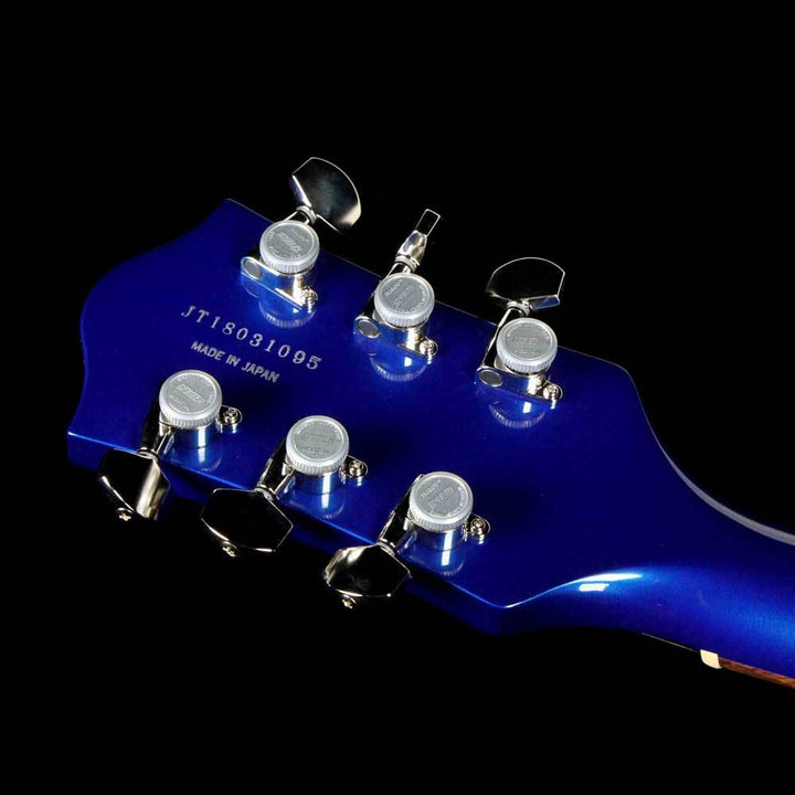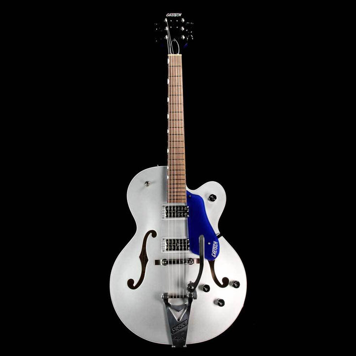 This used Gretsch Players Edition G6118T-ISV Anniversary boasts a unique two-tone Iridium Silver / Azure Metallic finish! This Anniversary has been tweaked with the modern player in mind, with a slightly thinner 2.5" body depth and modern-output Filter'Tron humbuckers. Other features include the ML braced hollow maple body, Bigsby tailpiece with Rocking Bar bridge, and a rosewood topped maple neck with thumbnail inlays and locking Gotoh tuners. The guitar is in excellent condition with no notable damage.