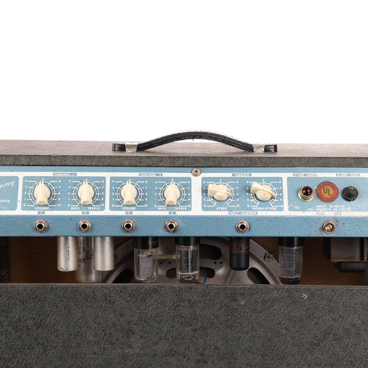 This Harmony H306 four inputs for two channels. The EQ control on channel one seems to be non functional as well as the Vibrato on both channels. The amp breaks up around noon and the 12 inch speaker handles the amp very well. This amp has a two prong power cord and we recommend that the next owner replace it with a modern three prong cord.