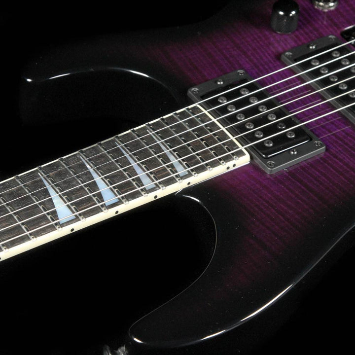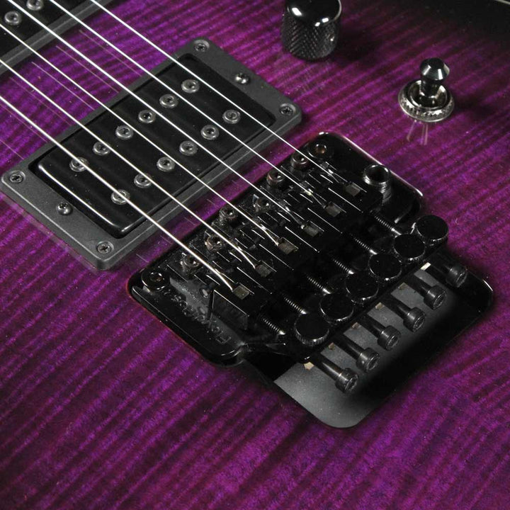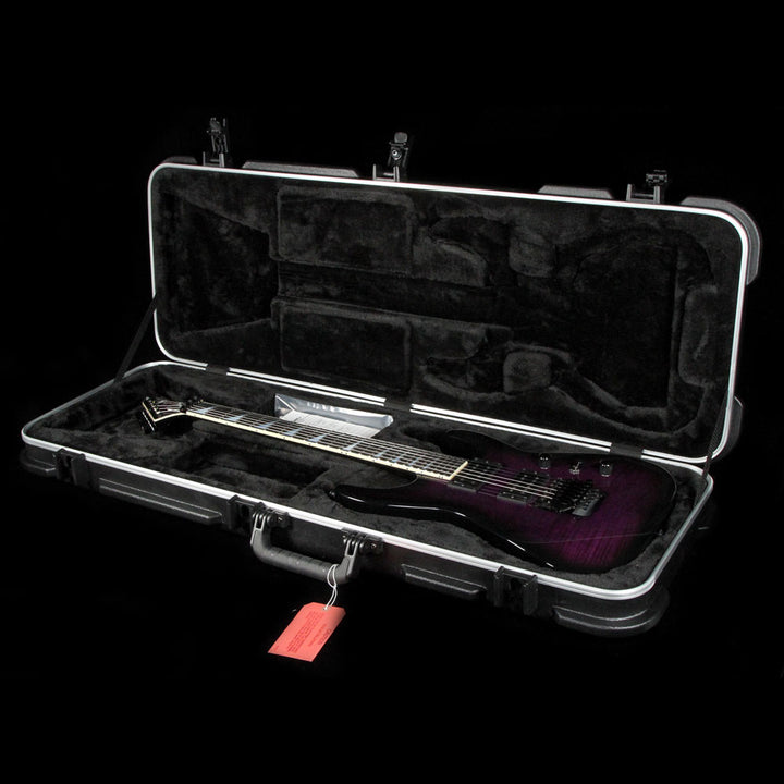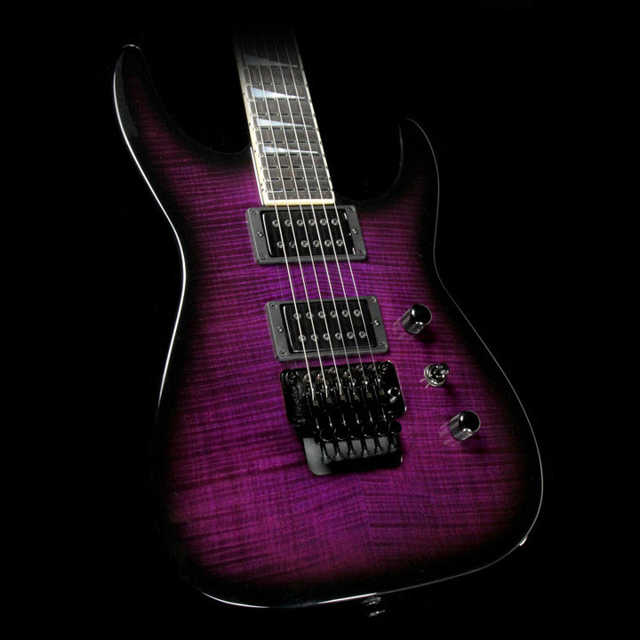 This awesome piece from the Jackson Custom Shop is a SL2H Floyd Rose Soloist with a trans purple burst finish that highlights all the figuring in the 1/8" flame maple top. The guitar has traditional Soloist neck through construction with an alder body and quartersawn maple neck, sharkfin inlays, and a pair of super tight sounding Bare Knuckle Juggernaut humbuckers. Add in the black hardware to match the finish, and this guitar is ready to shred and turn some heads!