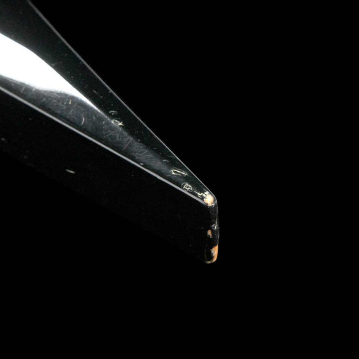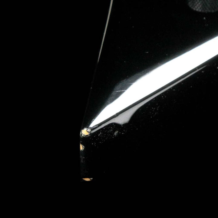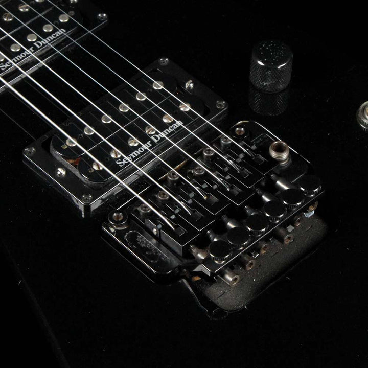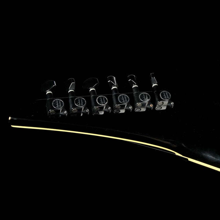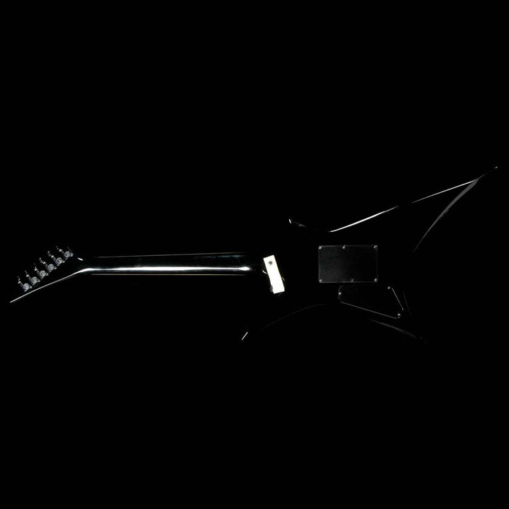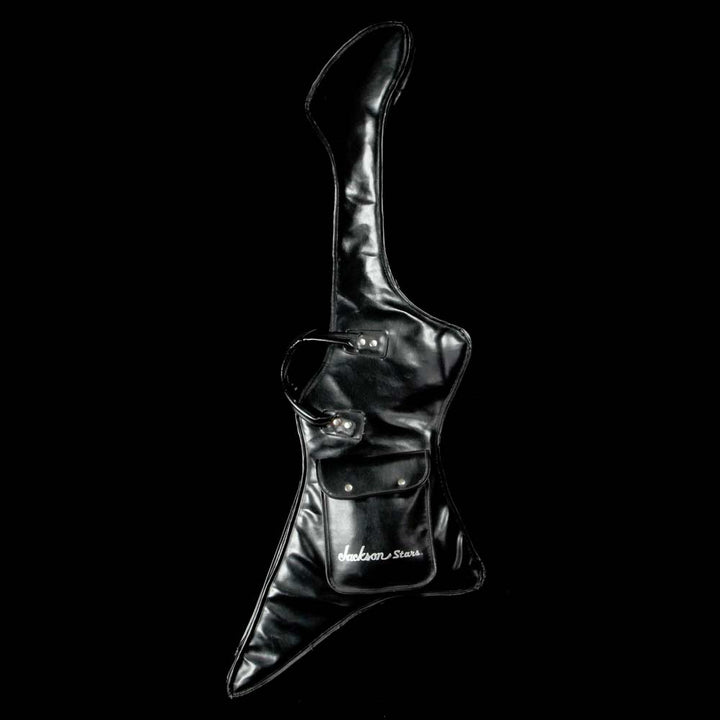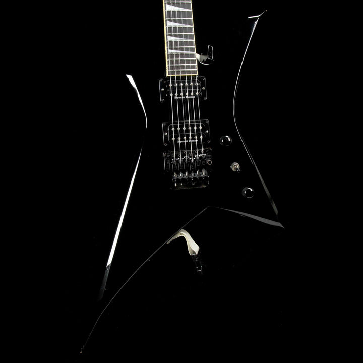 This is a great playing Jackson KS-2 Kelly model in black, in overall very good playing condition with some light wear around the body. The guitar has an alder body with an ebony fretboard, Sharkfin inlays, two Seymour Duncan SH1n and TB5 humbuckers, and a Floyd Rose tremolo. The guitar even comes with a fitted leather gigbag, which looks super cool outlining the unique shape of the body! This KS-2 has DiMarzio ClipLok strap ends installed on it, with a strap included in the gigbag. There’s a chip on the wing tip, and a small dent on the back near the plate. Most of the pointed ends of the body have light wear. The tab is also missing from the gigbags zipper - it still closes and protects the guitar as it should.